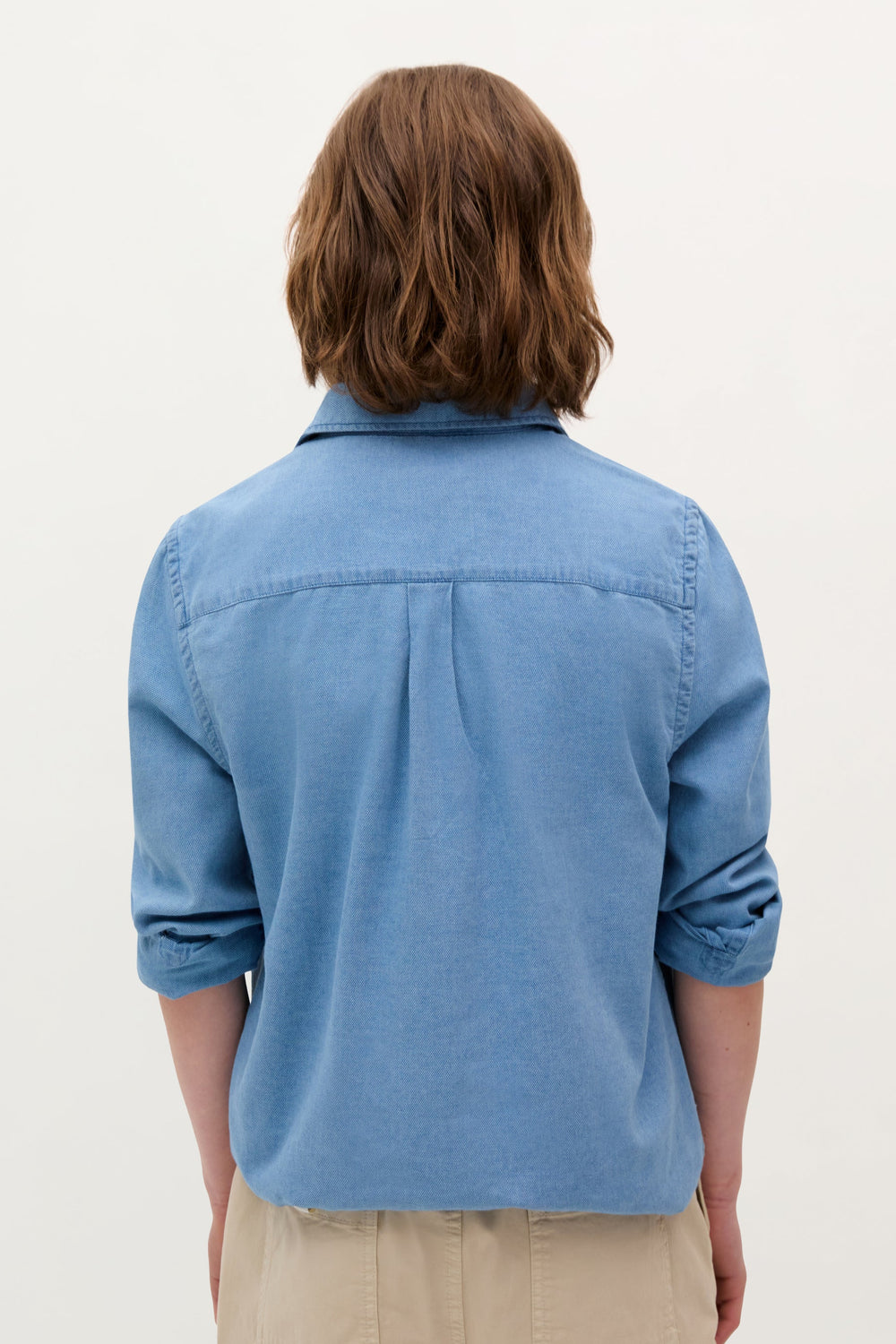 Chemise denim 100 % coton biologique. Coupe droite, col polo, manches longues à poignets. Fermeture par boutons et logo skull brodé sur la poitrine.