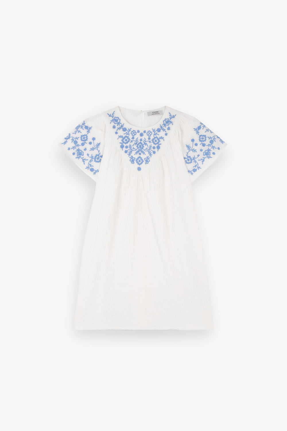Robe en tissu 100 % coton, avec col droit et manches courtes. Fermeture en forme de goutte dans le dos. Motifs brodés sur le devant et sur les manches. Intérieur doublé.
