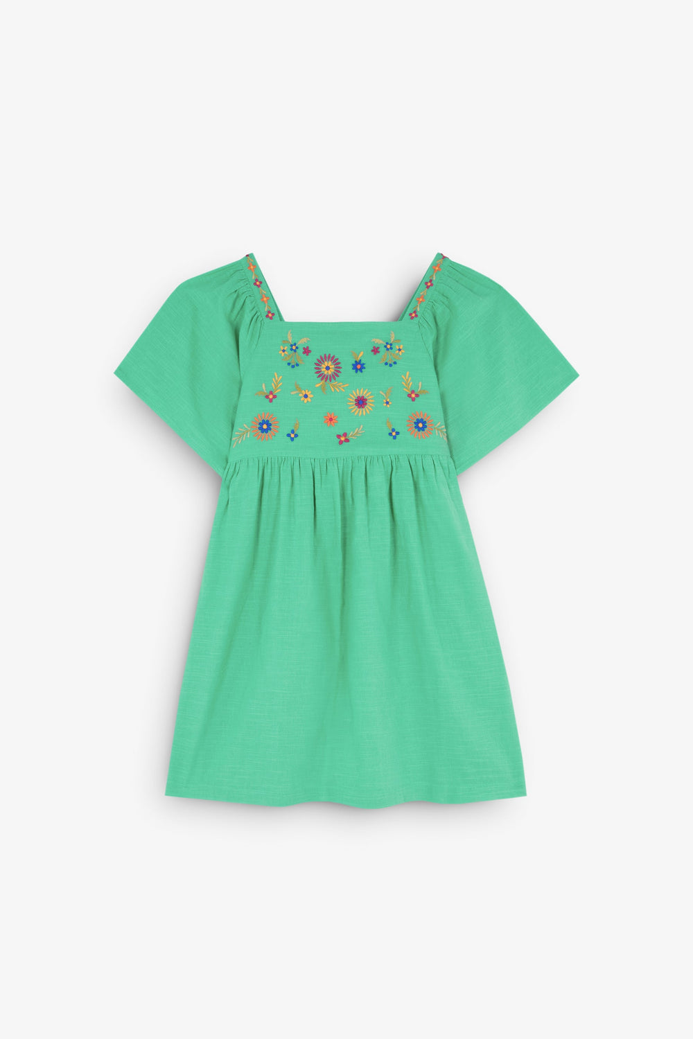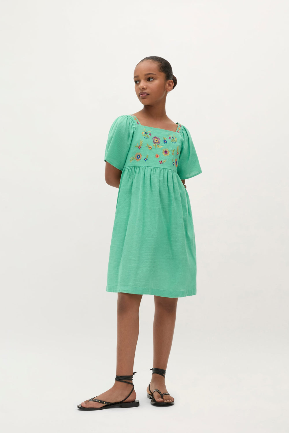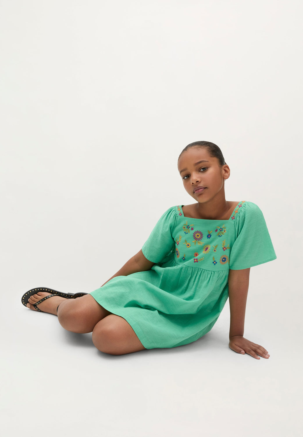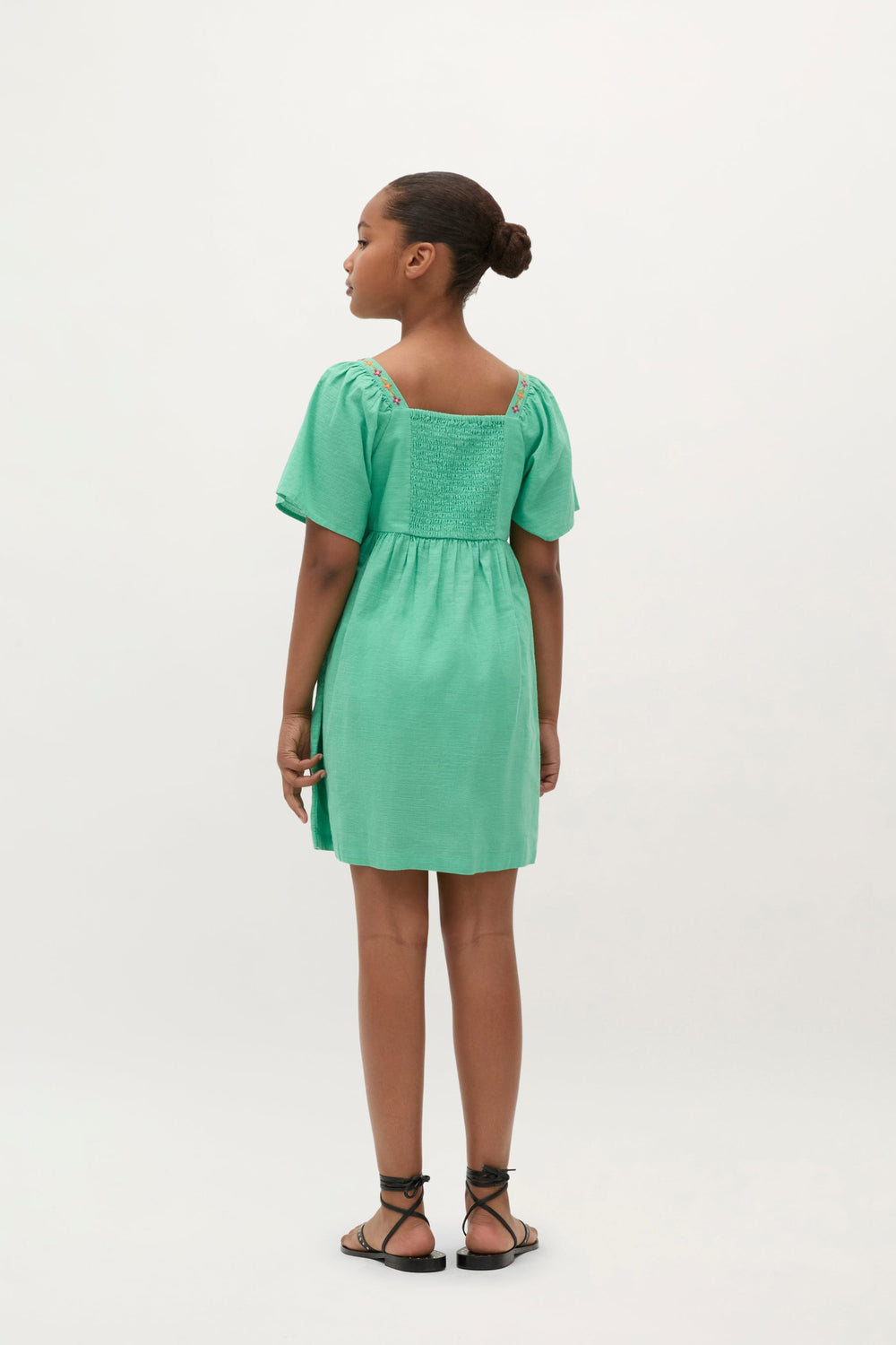 Robe confectionnée en 100 % coton biologique à détails brodés sur la poitrine et les épaules. Coupe babydoll évasée, encolure carrée et manches courtes, plissée sur l’épaule. Dos en nid d’abeille. Coupe mini.