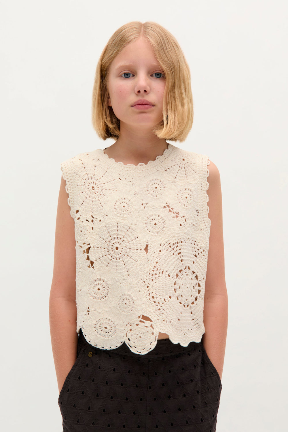 Top with crochet flower embroidery. Sleeveless design with round neck. Teardrop button fastening at the back. Metal logo tag detail on the hem.