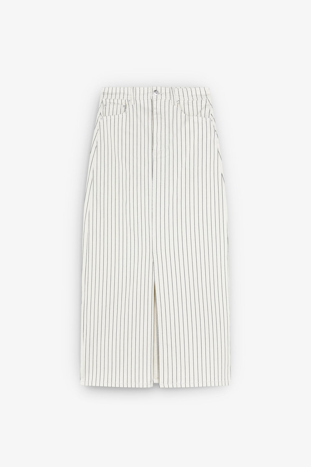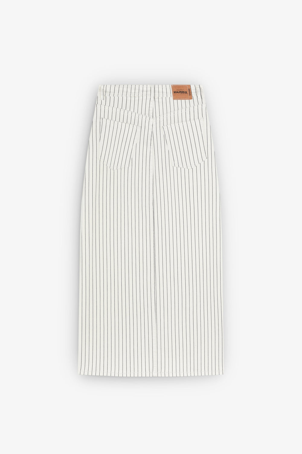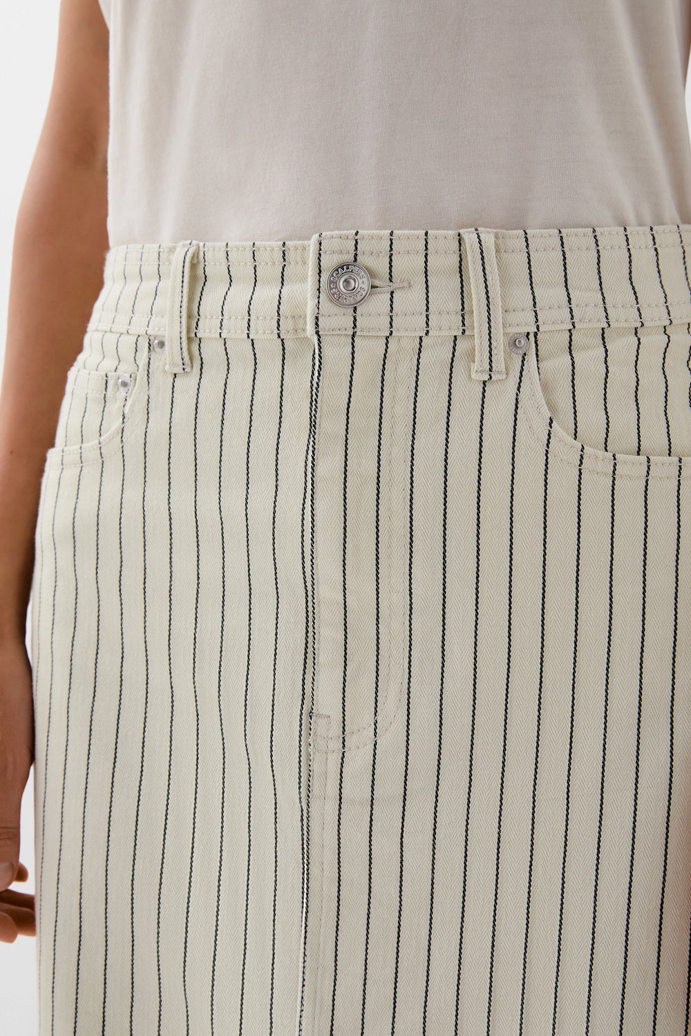 Jupe en denim rayée confectionnée dans un mélange de coton et d’élasthanne. Fermeture éclair et bouton, poches en biais devant. Fendue devant.