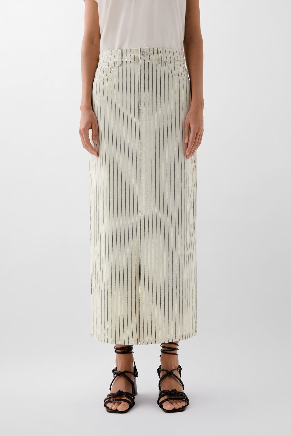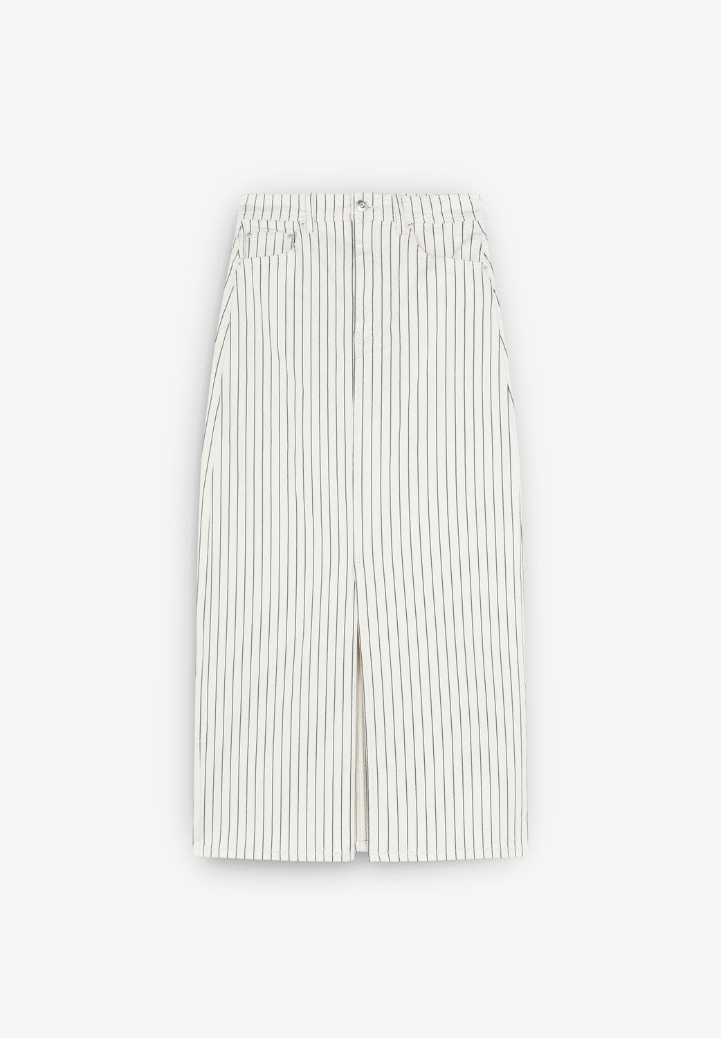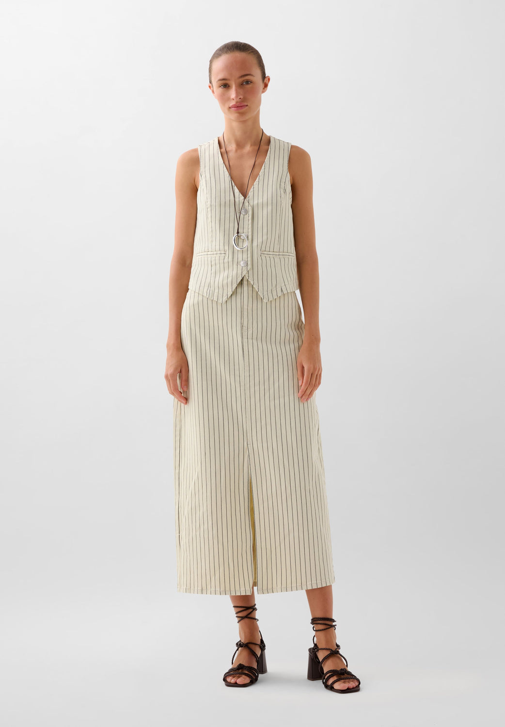 Jupe en denim rayée confectionnée dans un mélange de coton et d’élasthanne. Fermeture éclair et bouton, poches en biais devant. Fendue devant.