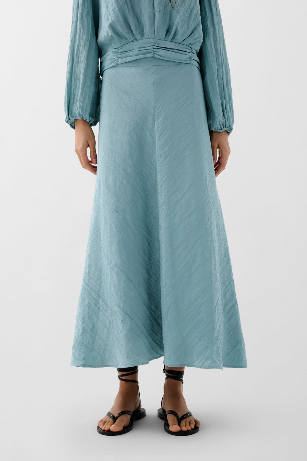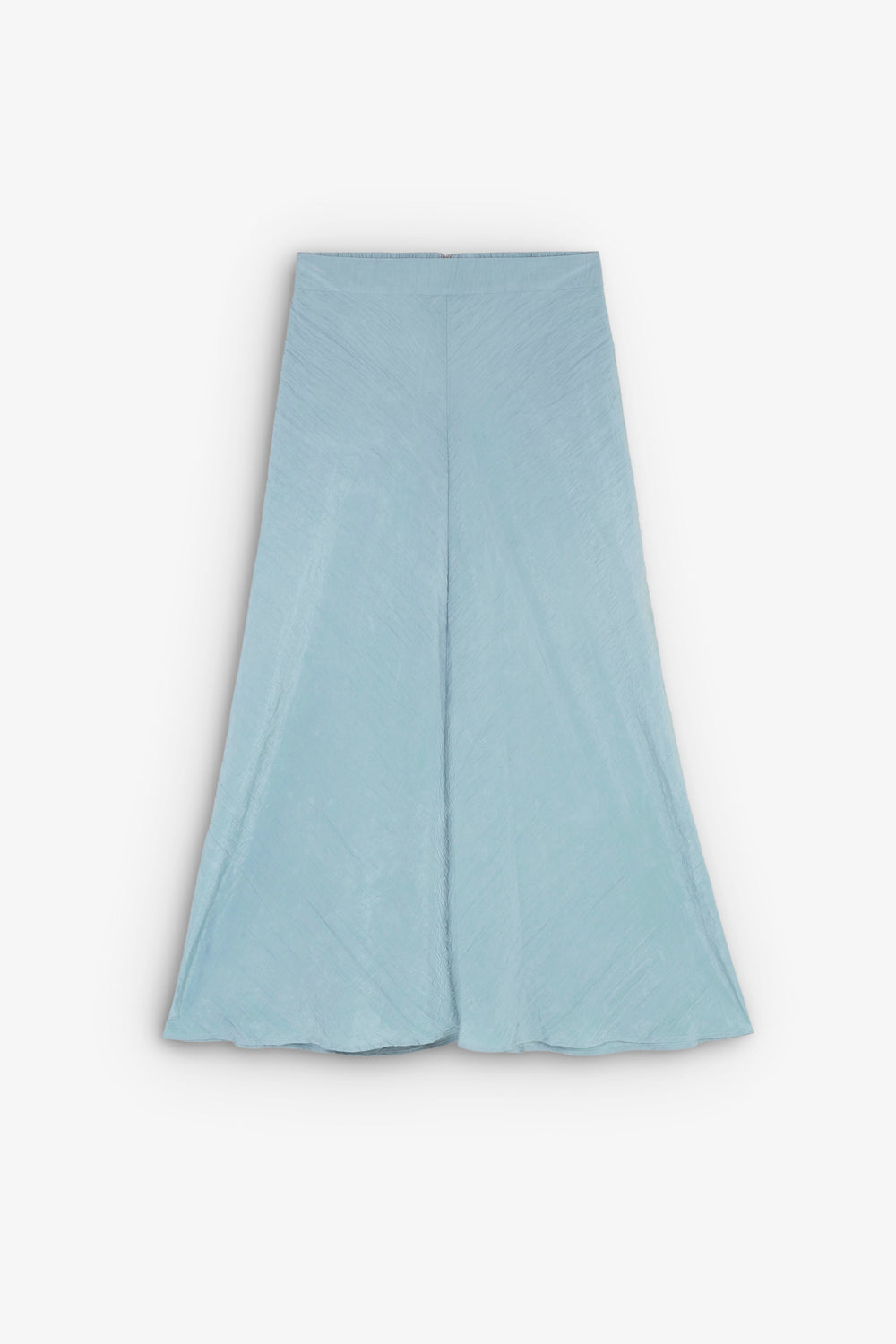 Jupe midi texturée à taille élastique et fermeture éclair dissimulée derrière.