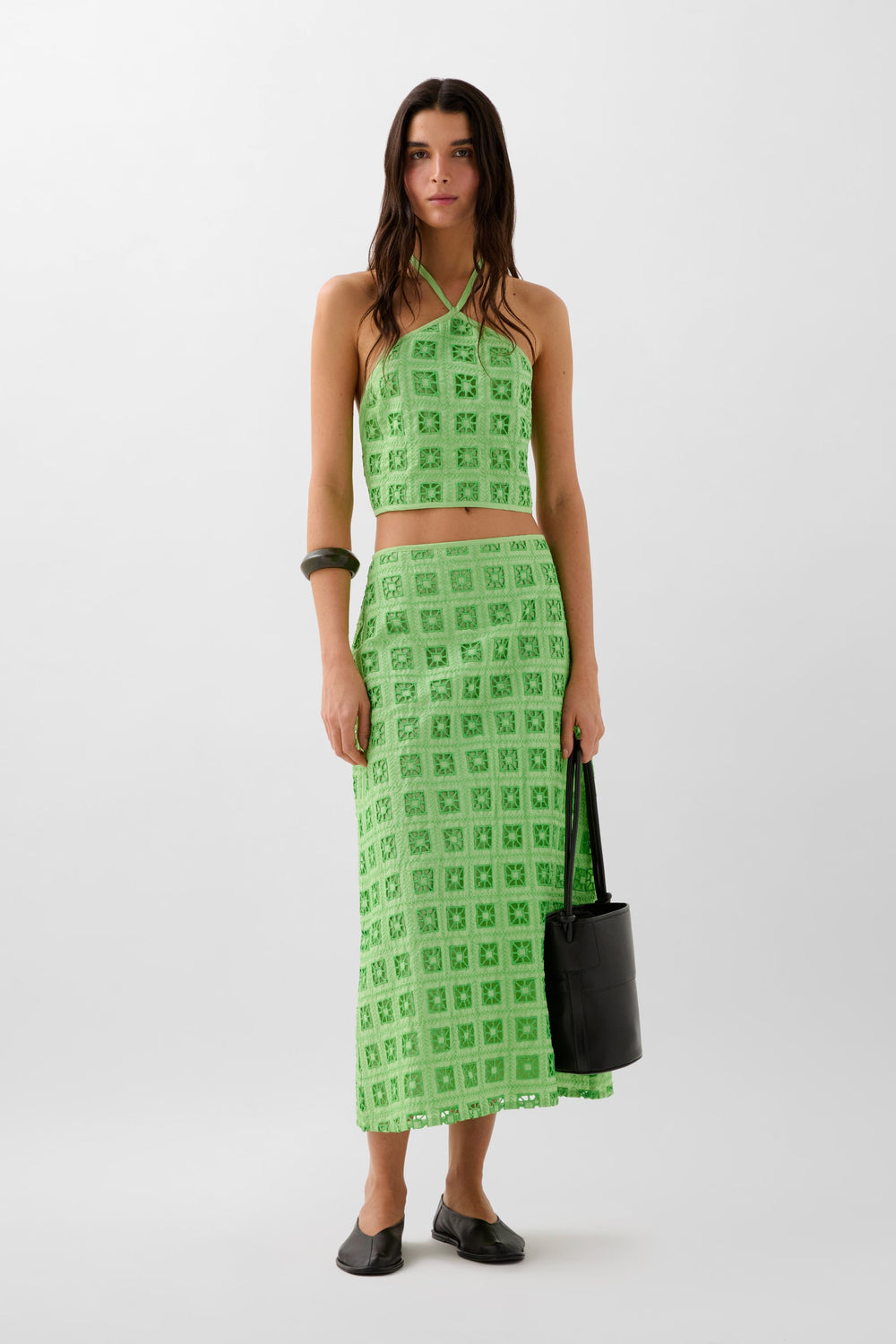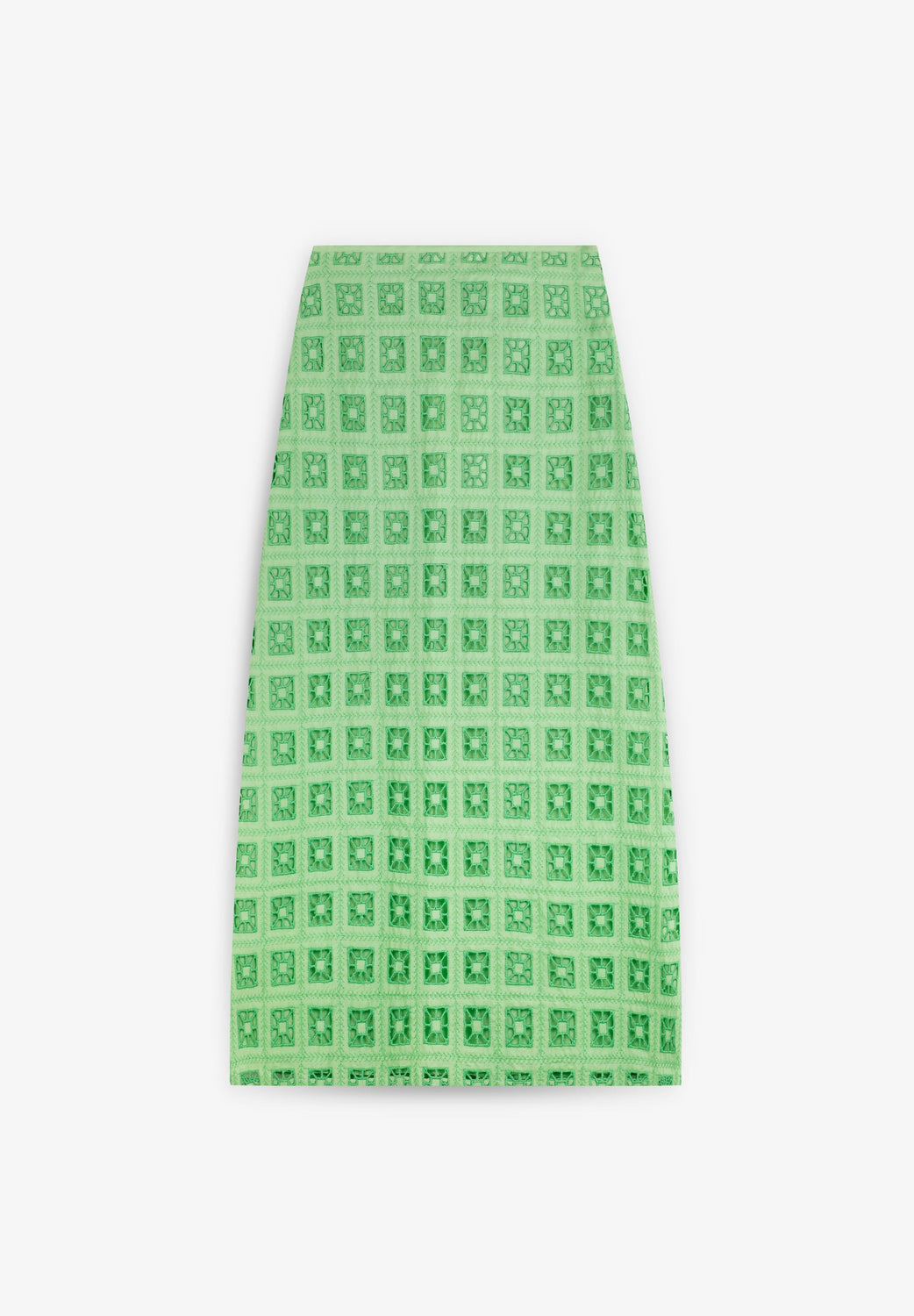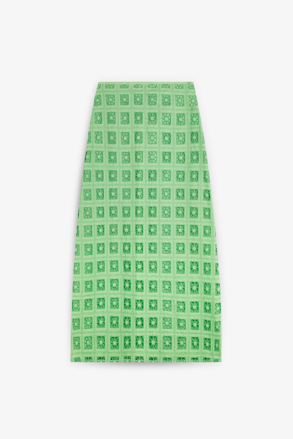 Jupe 100 % coton ornée de broderies. Coupe midi avec fermeture Éclair dissimulée.