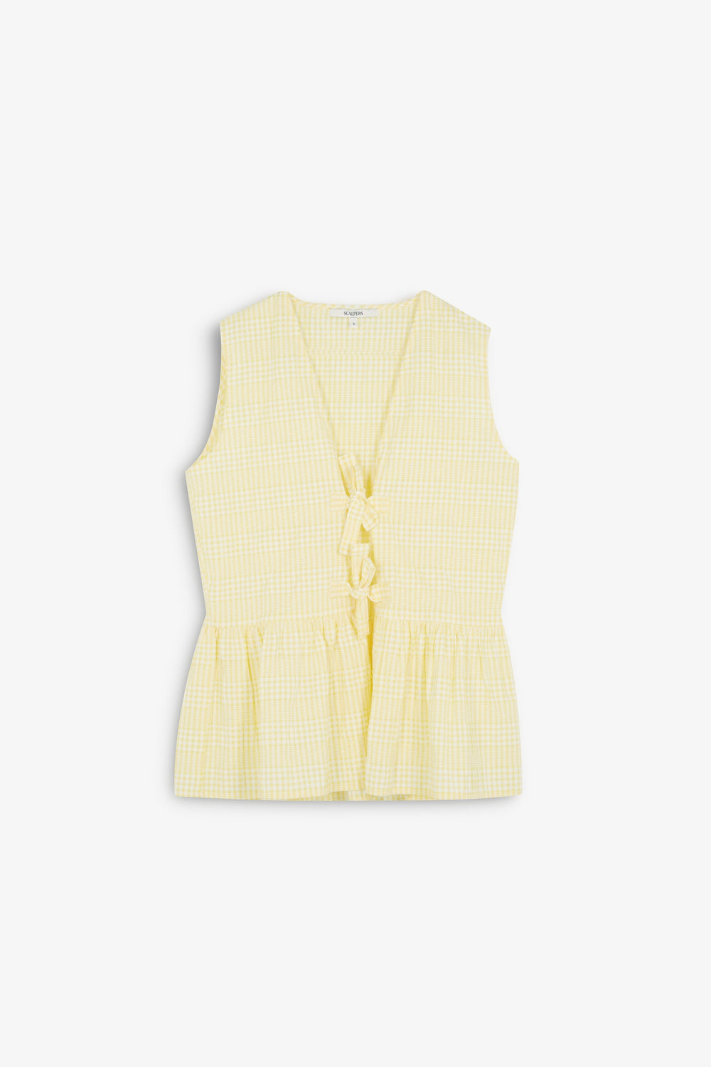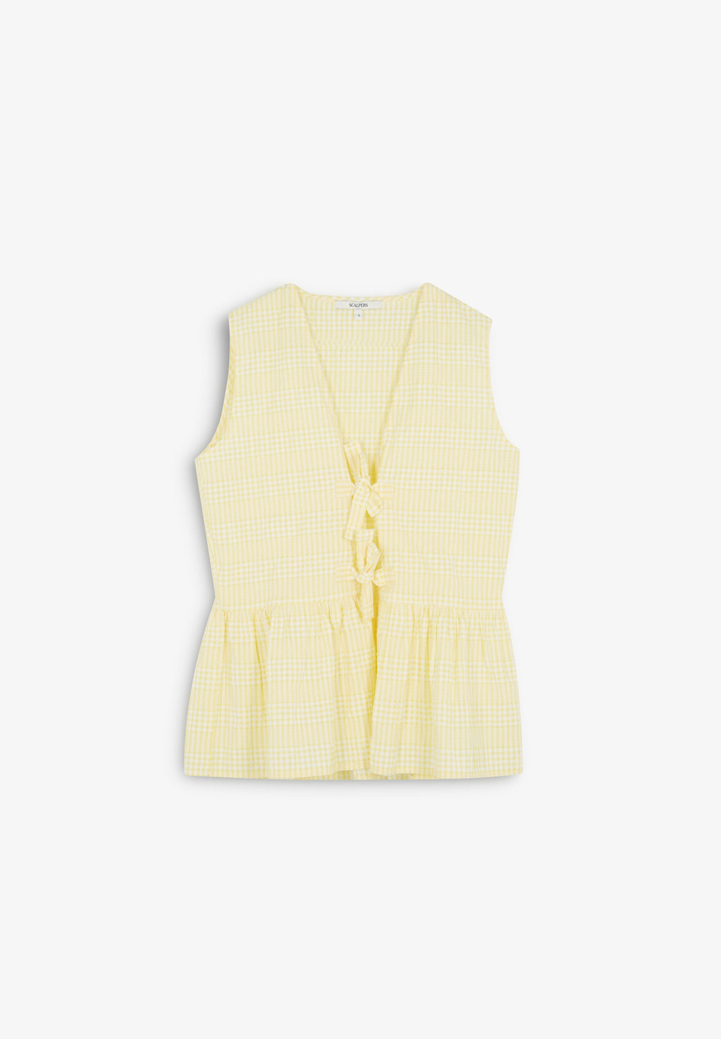 Top confectionné dans un mélange de coton imprimé vichy. Coupe droite, décolleté en V et liens à nouer devant. Emmanchures américaines et volant dans le bas.