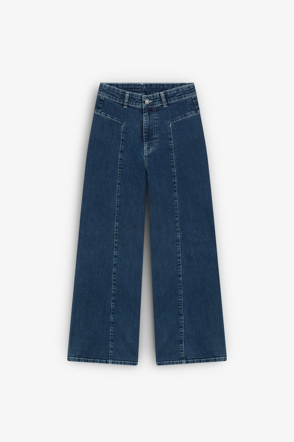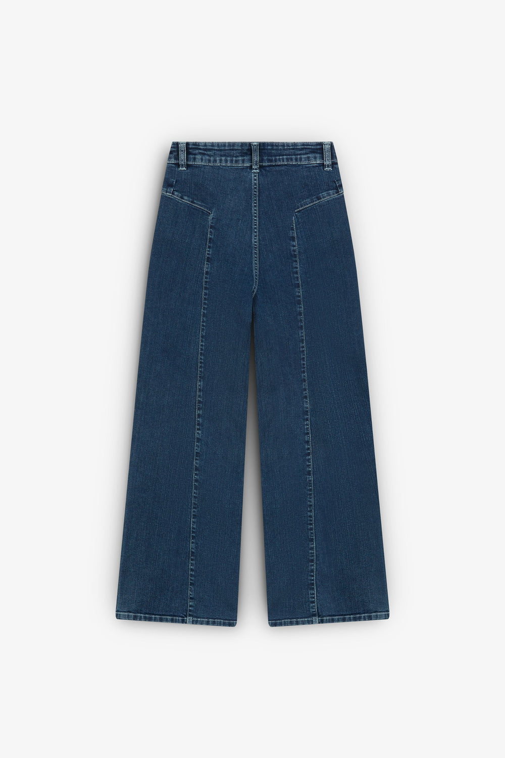 Jean confectionné en coton légèrement extensible. Coupe jupe-culotte taille haute, fermeture éclair et bouton, passants de ceinture. Coutures marquées.