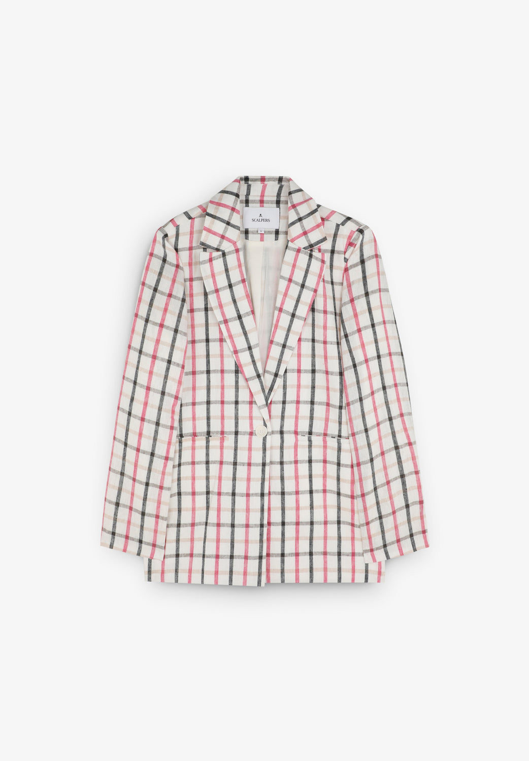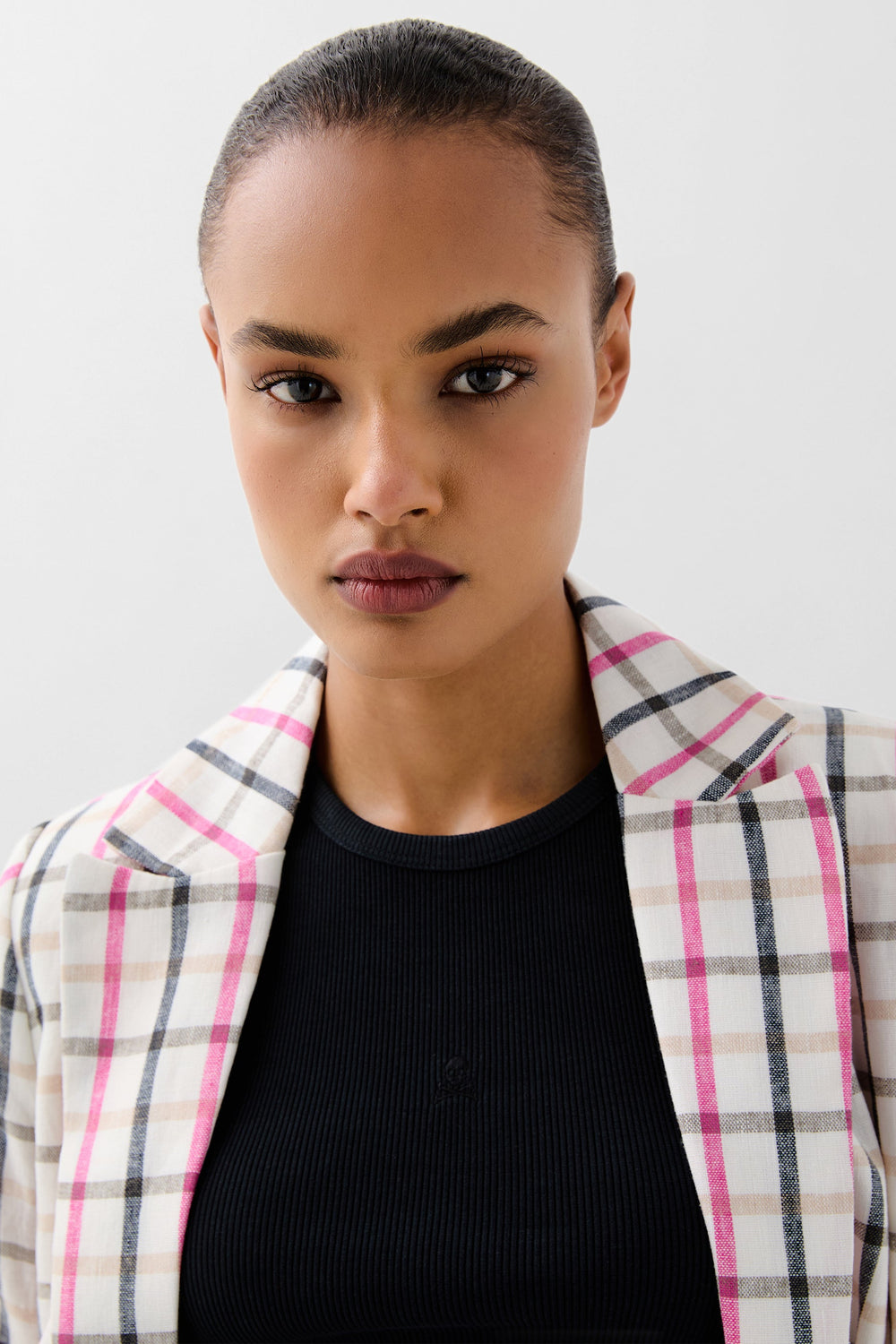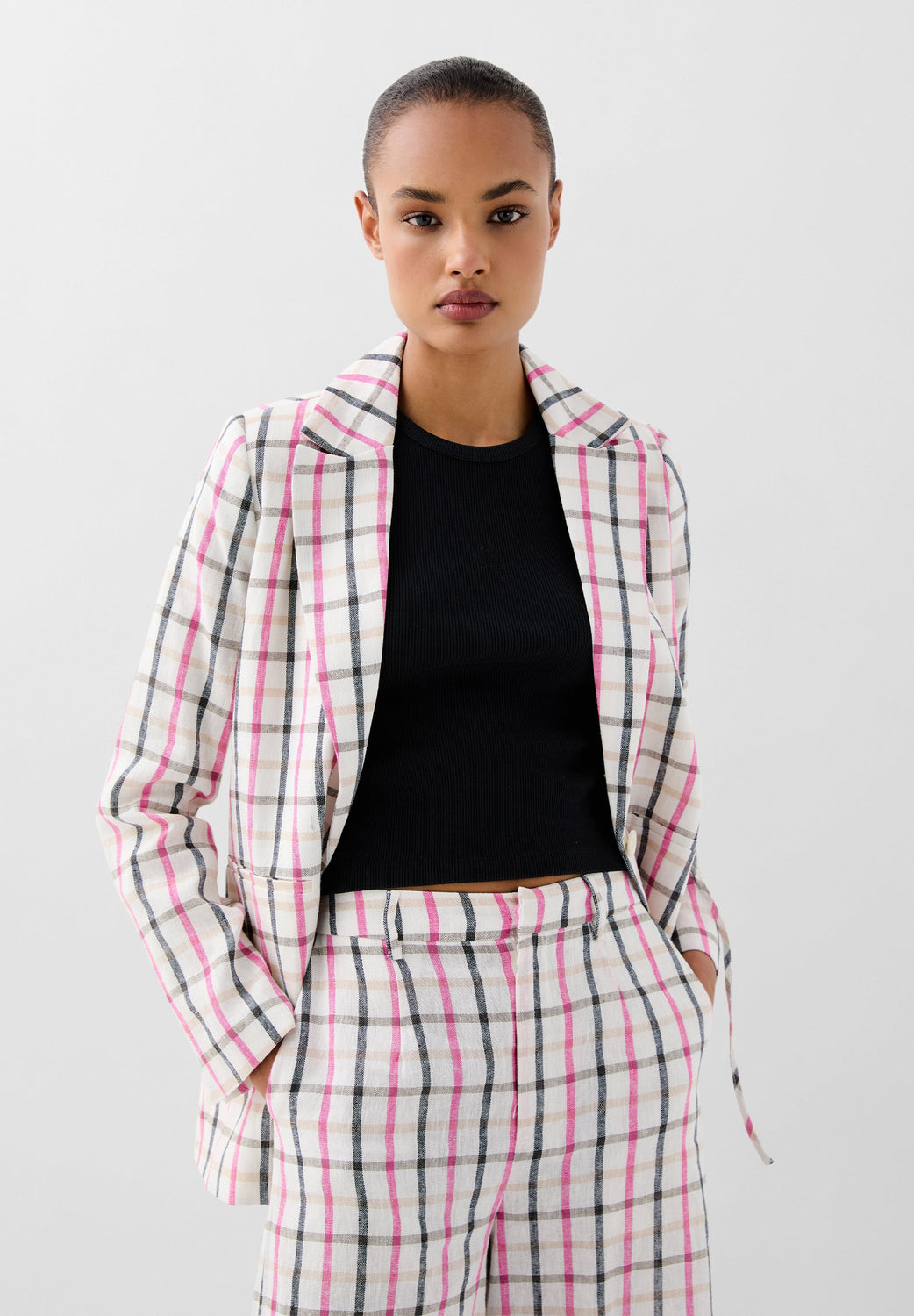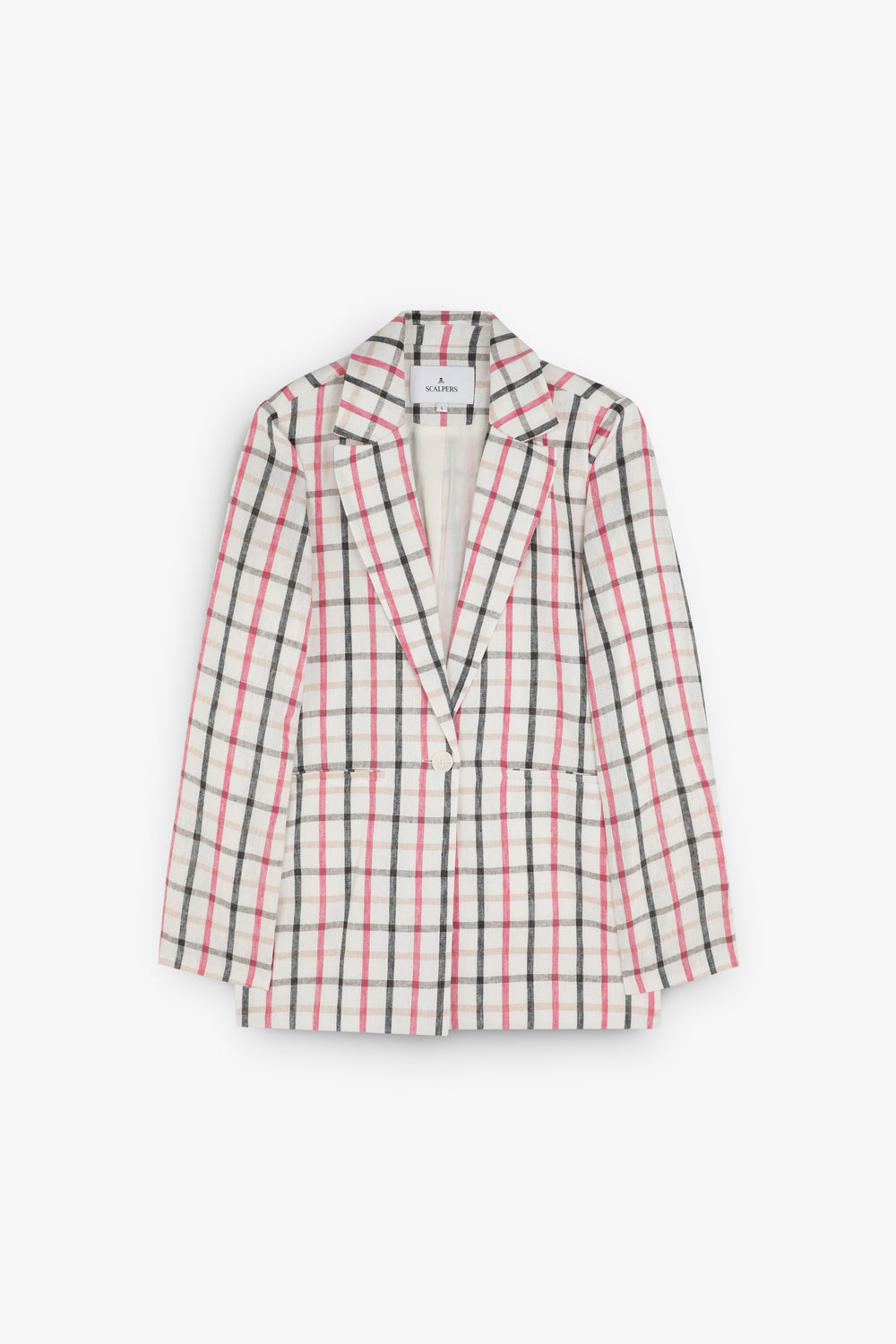 Veste en lin et coton mélangés. Doublure intérieure 100 % coton. Manches longues. Fermeture par boutons sur le devant. Col à rabat. Imprimé Vichy.