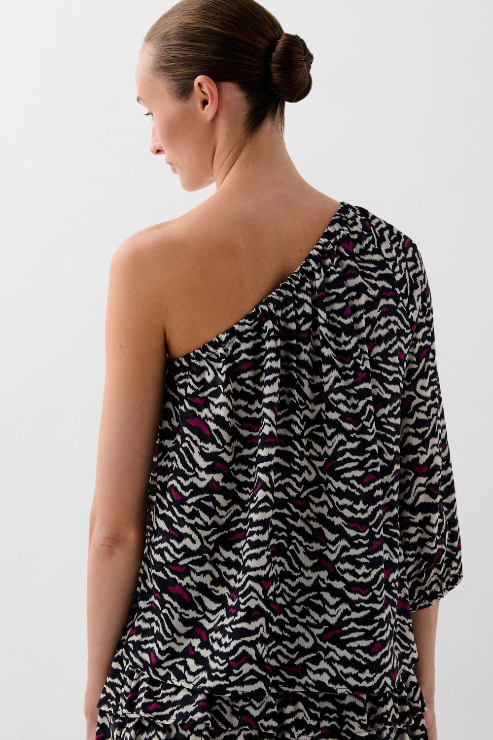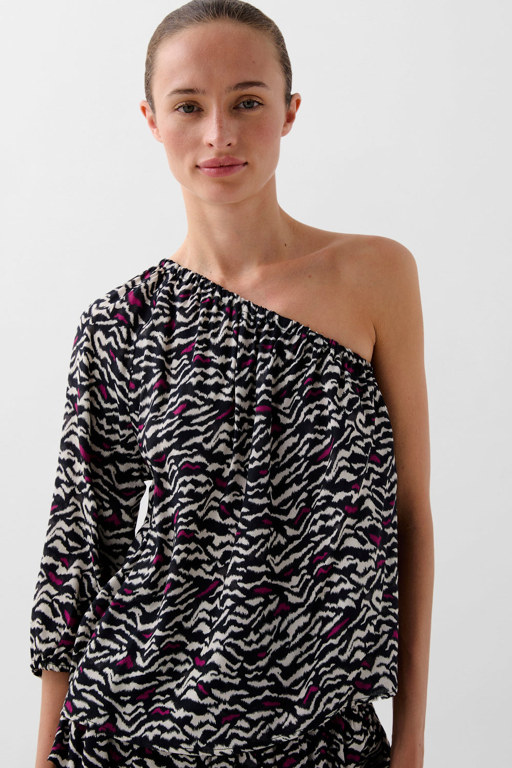 Chemisier 100 % viscose à imprimé motif animal. Coupe droite, col asymétrique, manches légèrement bouffantes à poignets élastiques.