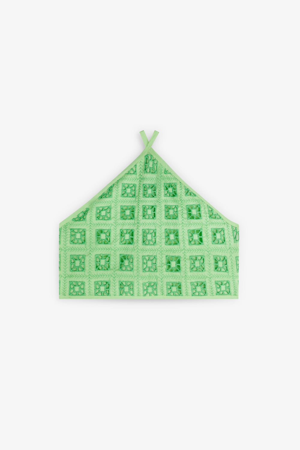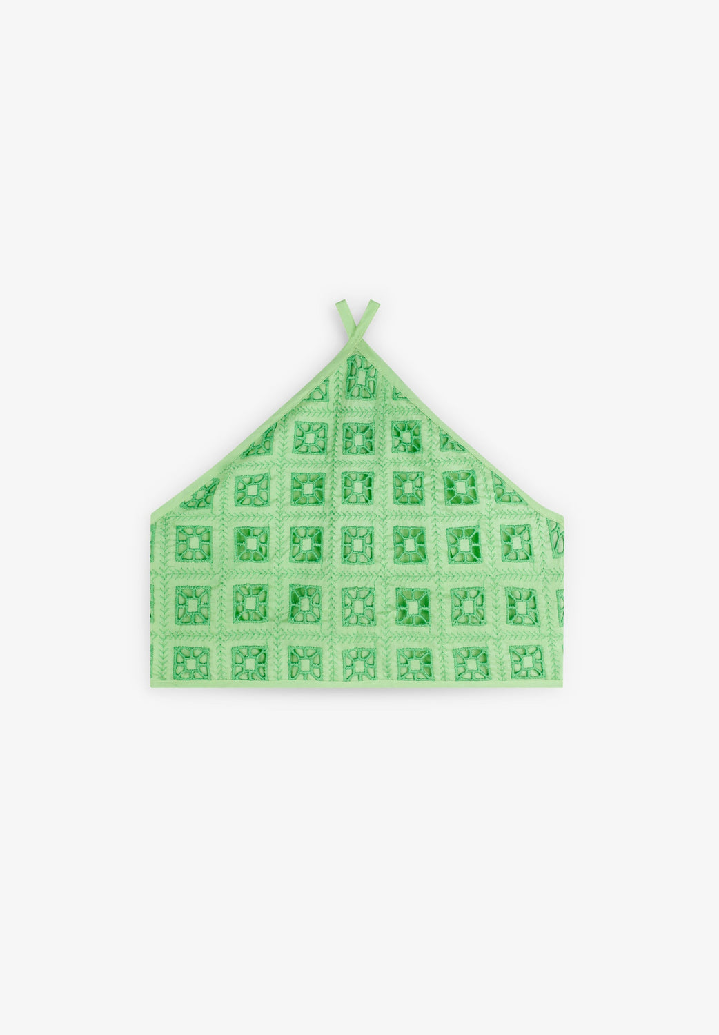 Top 100 % coton orné de détails brodés. Coupe crop, encolure américaine, lacets à l’encolure et dans le dos. Dos nu.