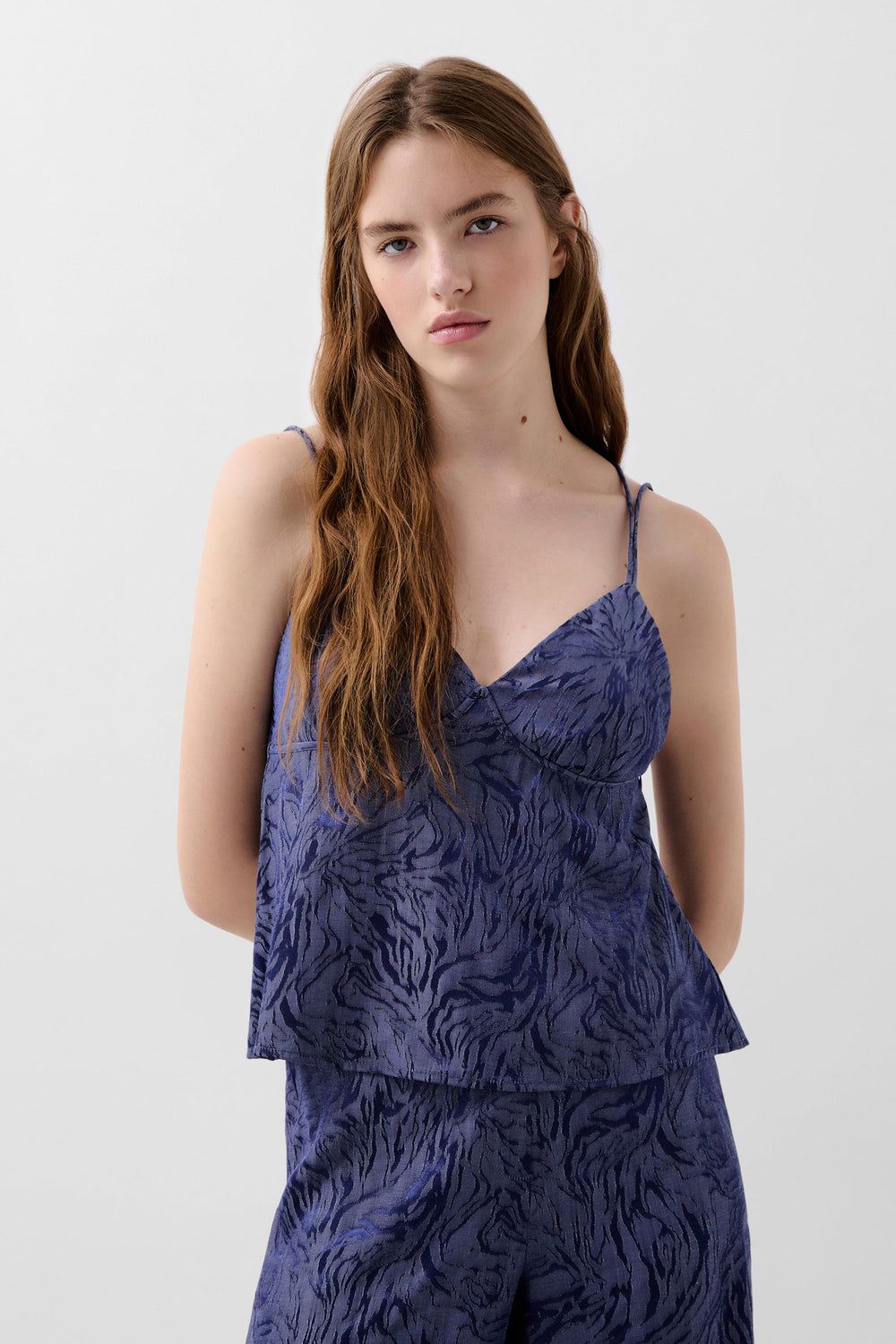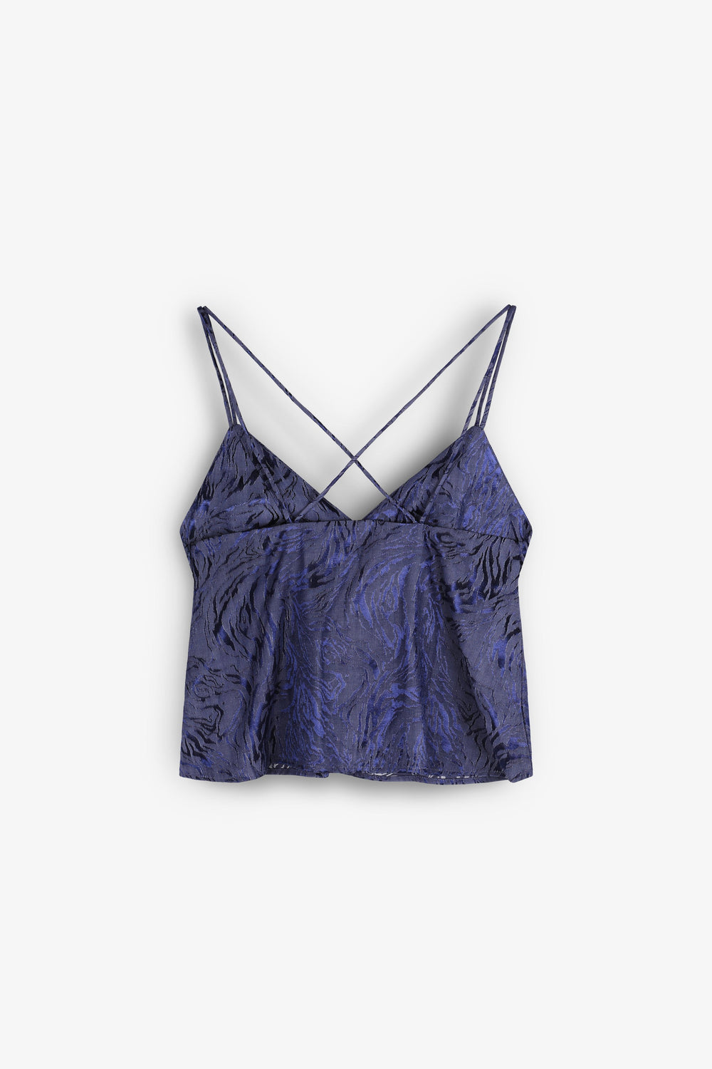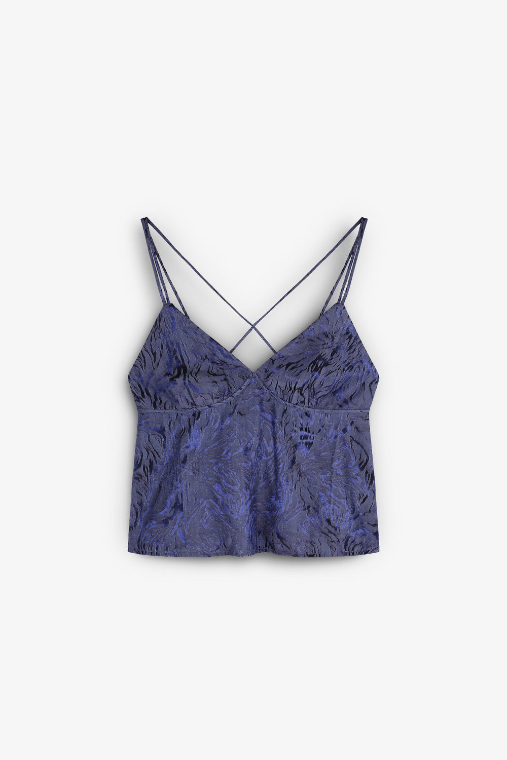 Top en tissu jacquard. Coupe droite, col en V et fermeture éclair. Bretelles fines croisées dans le dos.