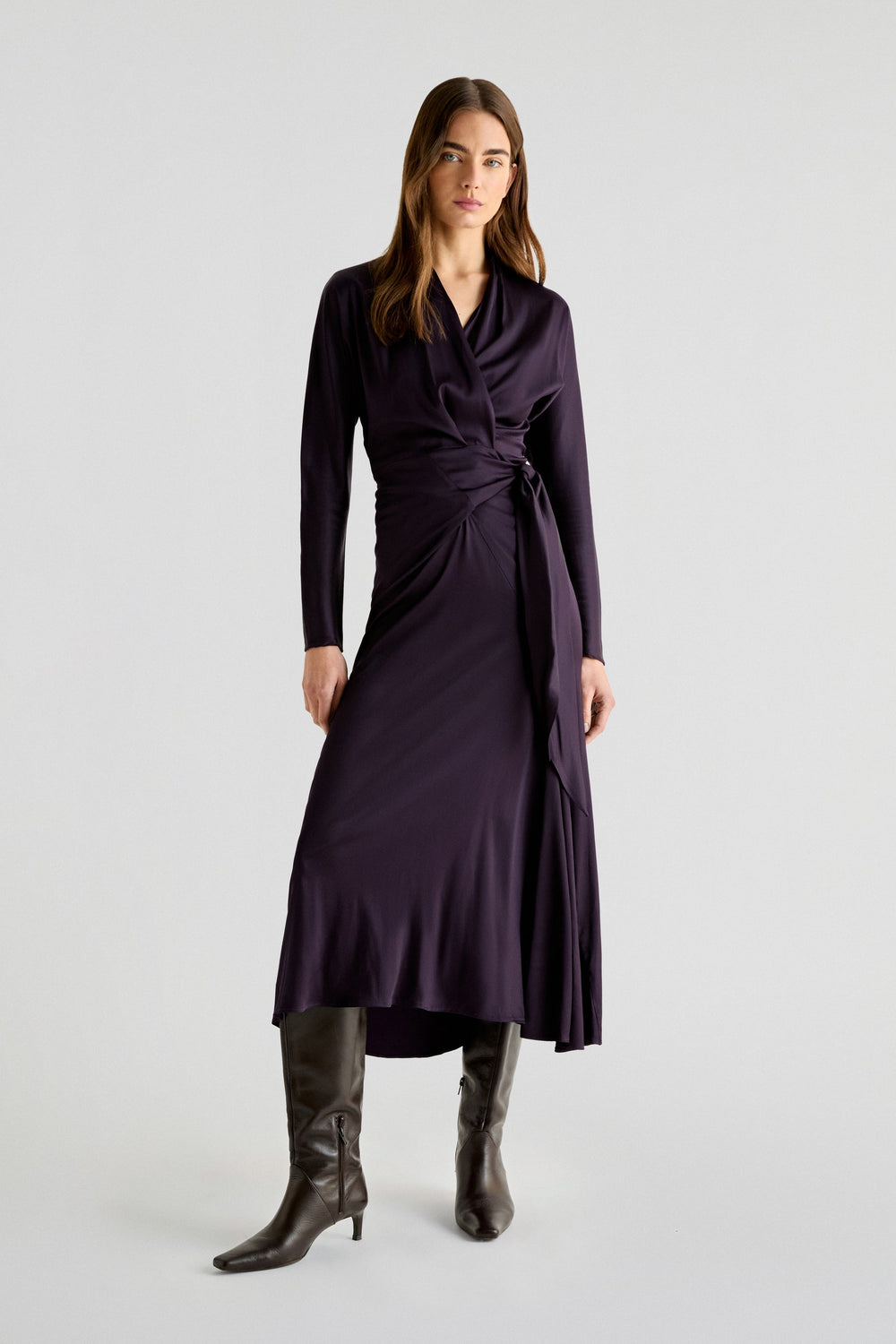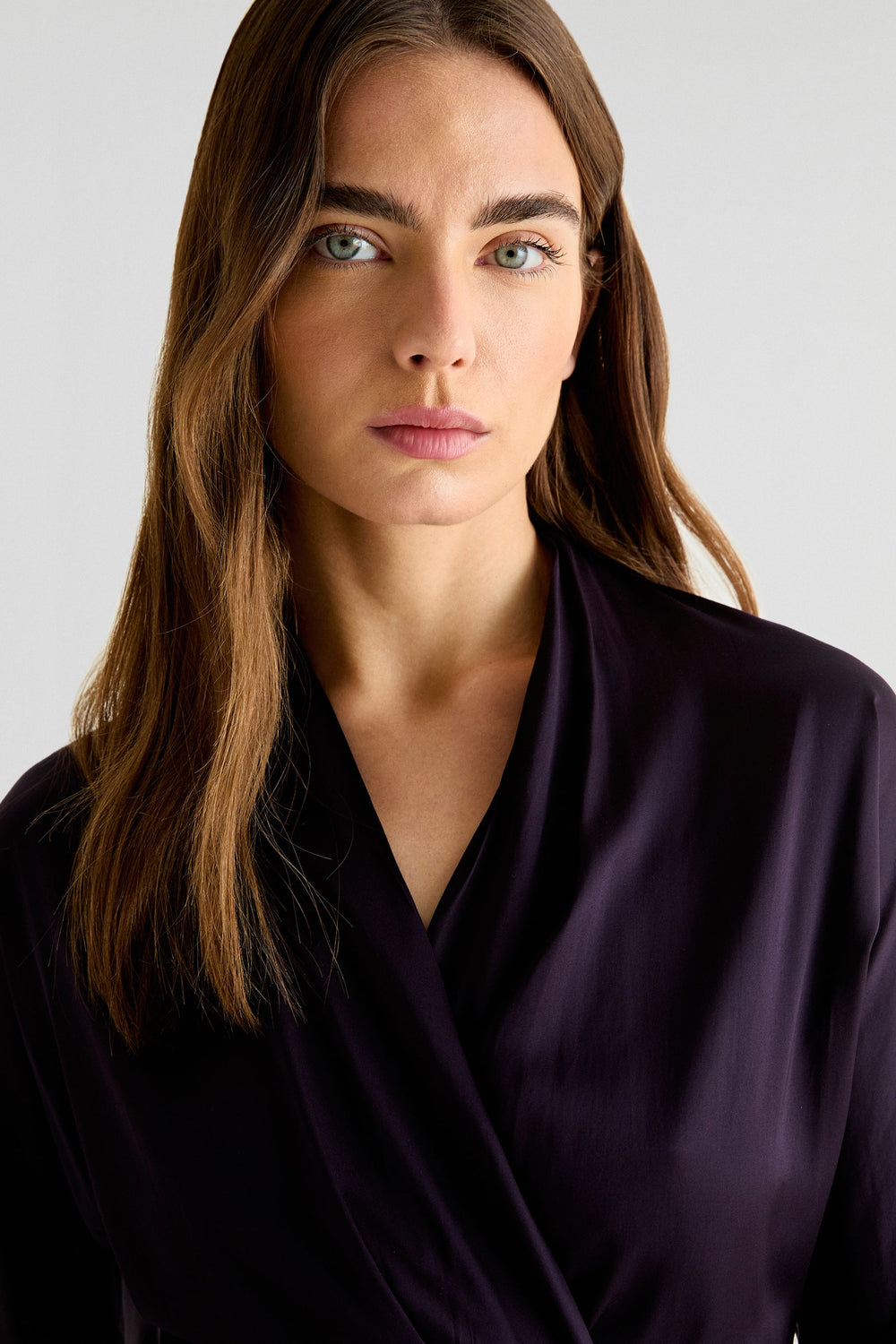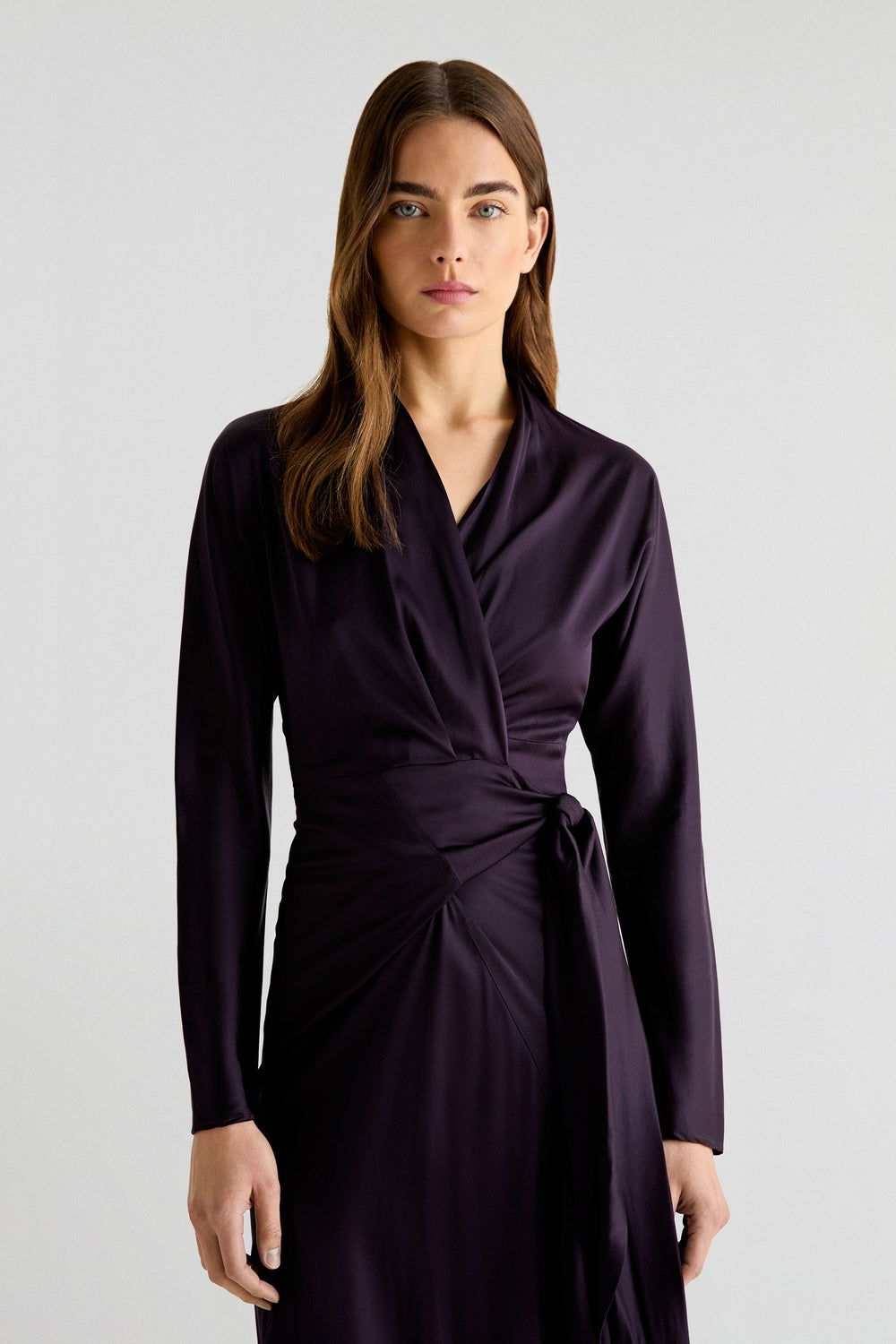Satin dress made of flowing fabric. Regular fit, V-neckline and sarong-style tie fastening. Long sleeves.