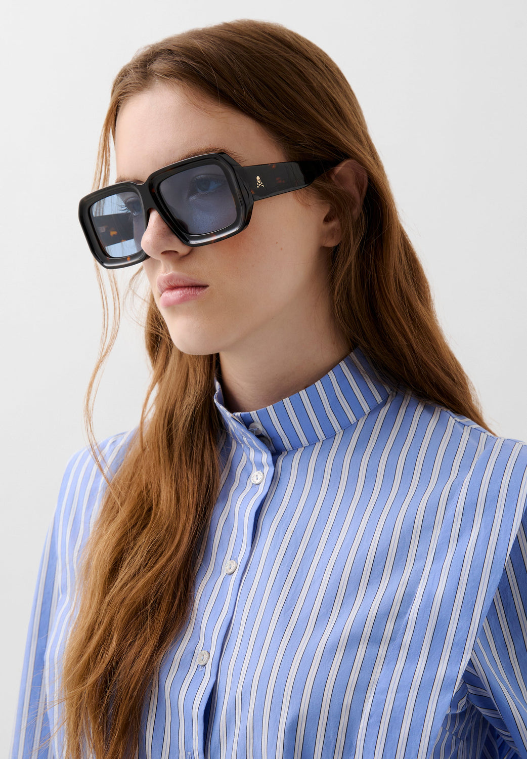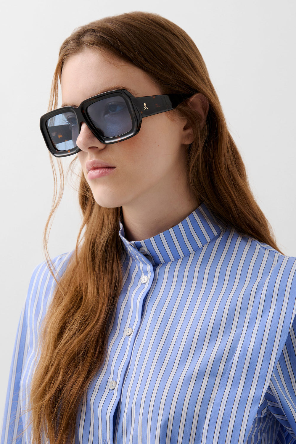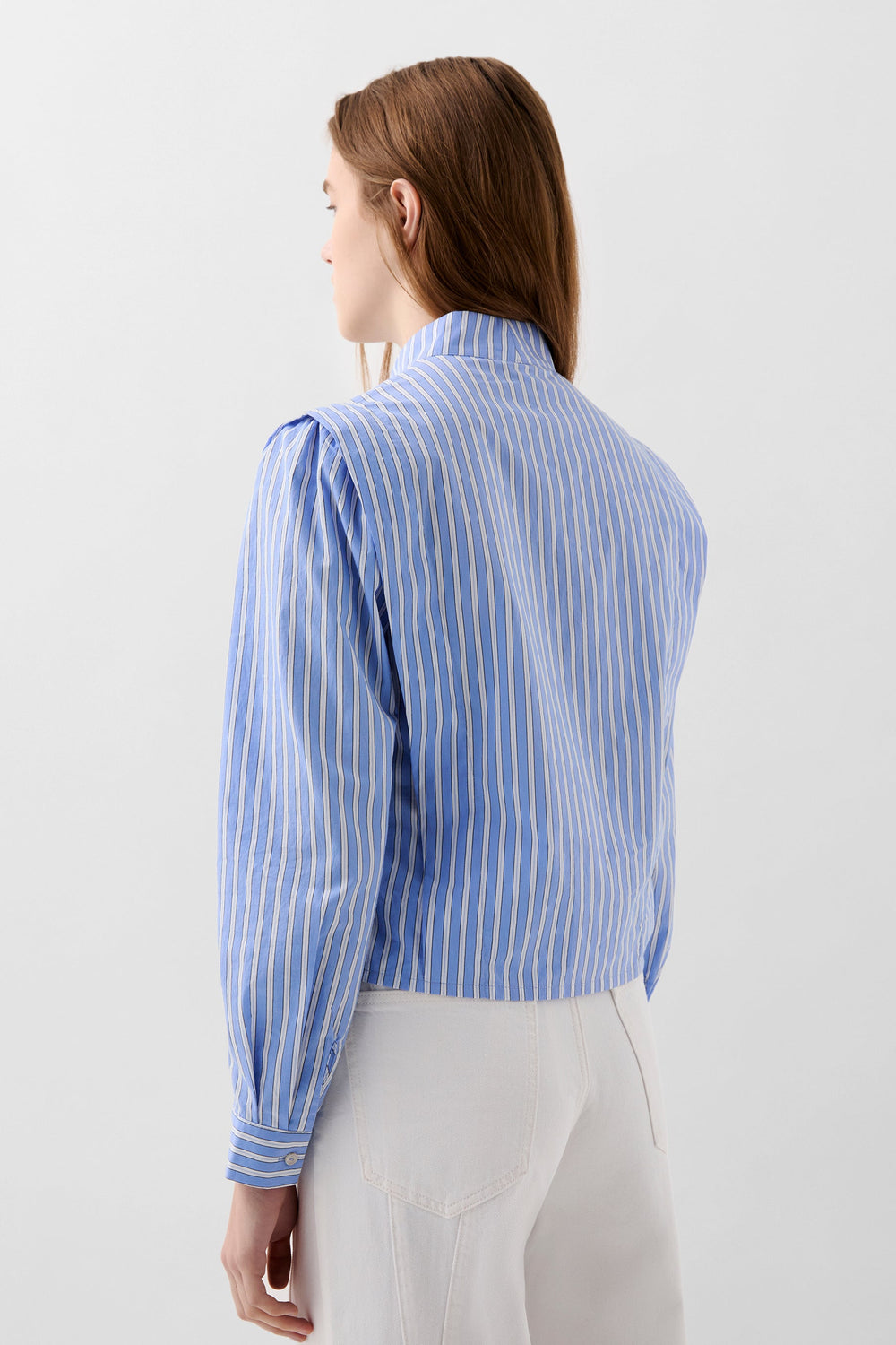 Chemise à rayures avec fronces au niveau des épaules. Confectionnée dans un mélange de coton. Coupe cropped, col montant et boutons. Poignets boutonnés.