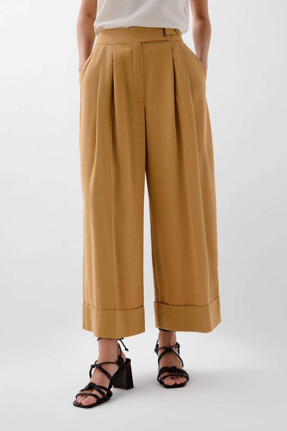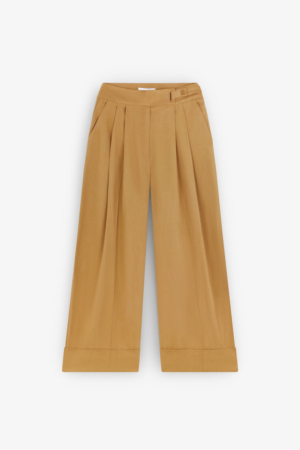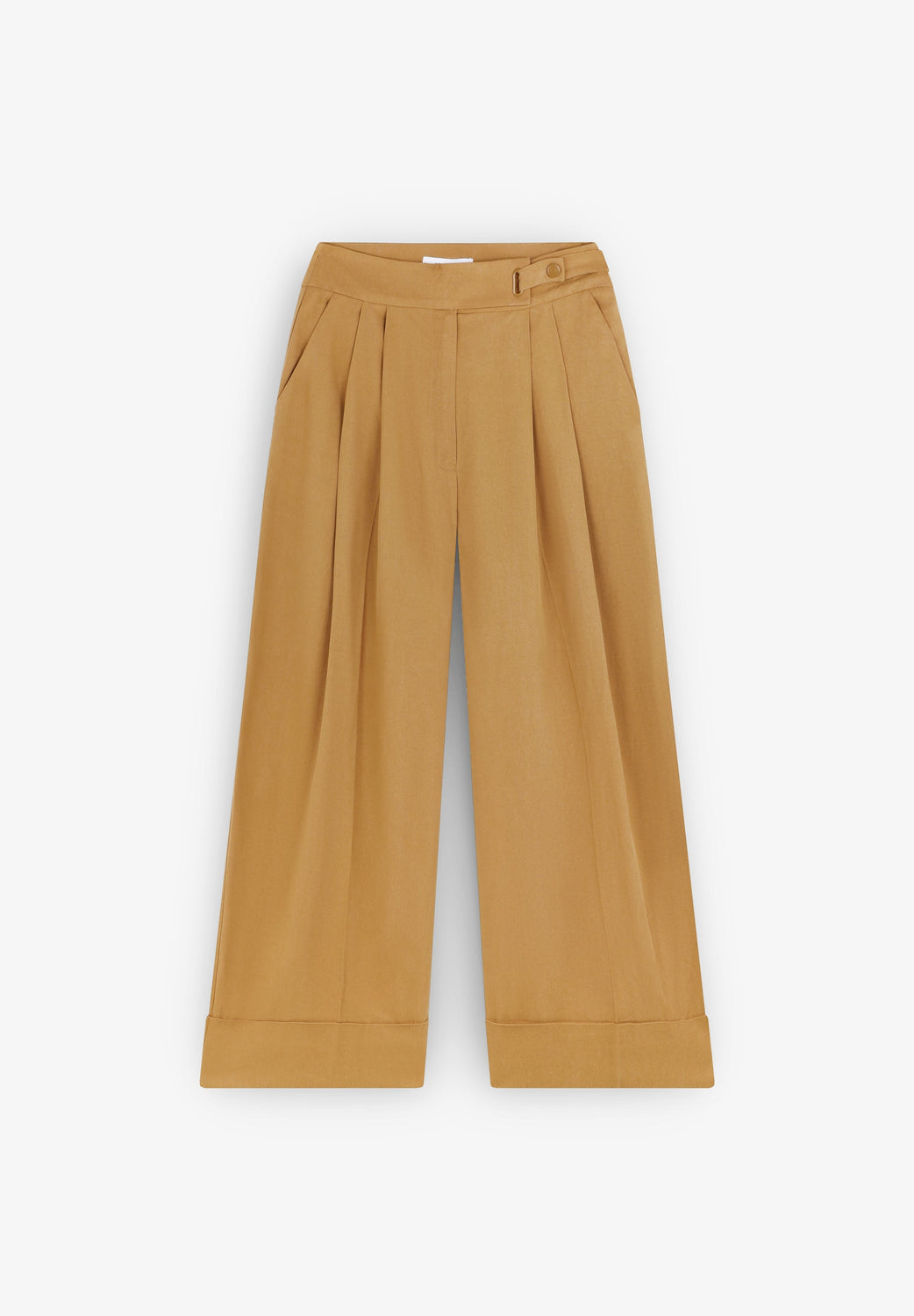 Pantalon en coton. Coupe large et ample de la hanche à la cheville. Taille haute. Boutonné à la taille. Deux poches sur les côtés. Une poche boutonnée derrière. Double pince devant. Revers dans le bas.