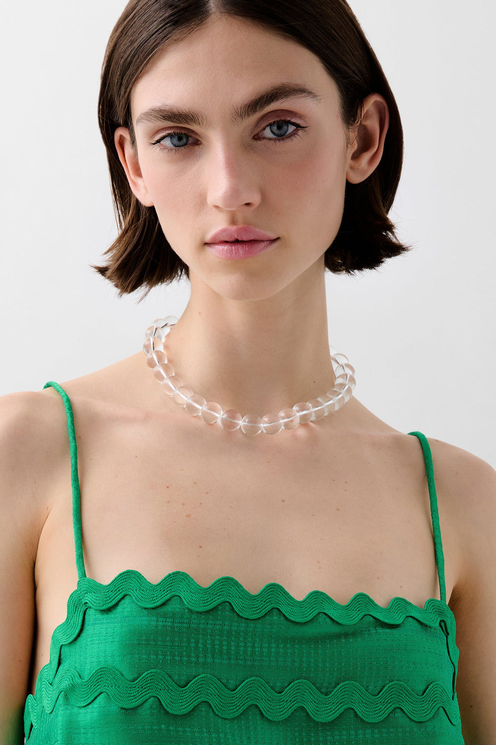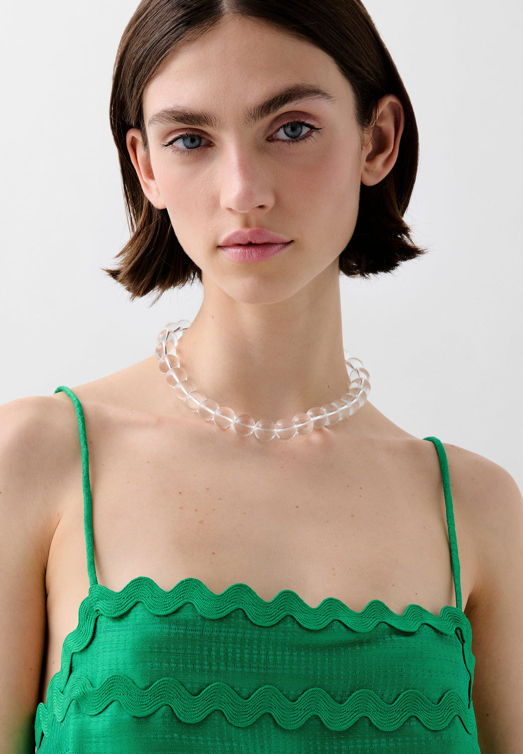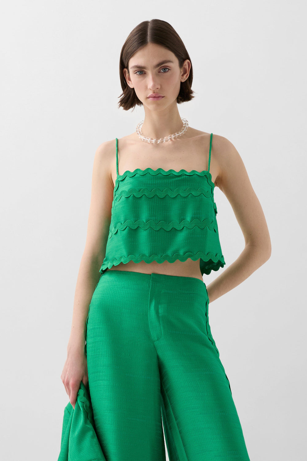 Top en tissu satiné avec ruban festonné. Coupe cropped, fines bretelles.