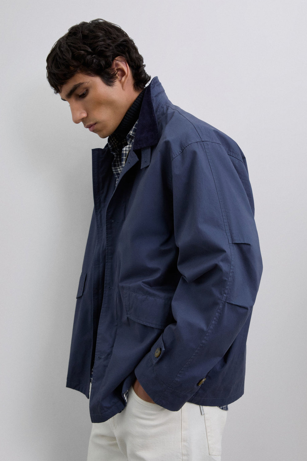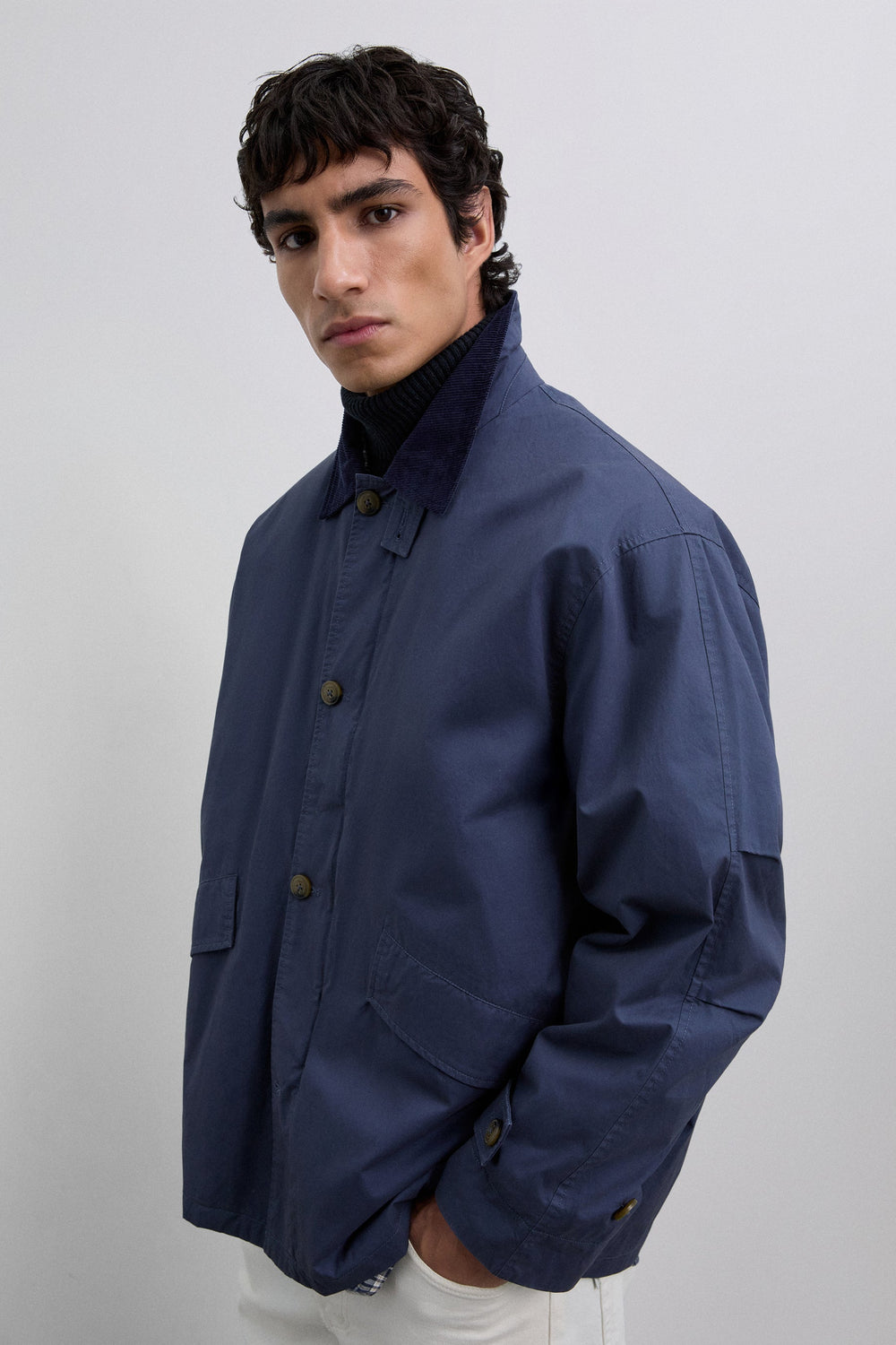 Veste 100 % coton BCI. Fermeture éclair et bouton personnalisés sur le devant. Col chemise en velours côtelé avec patte de boutonnage. Manches longues. Détails en velours côtelé sur les ouvertures des manches. Poches en biais devant. Coupe plus large. Patte de boutonnage à double bouton sur la manche.
