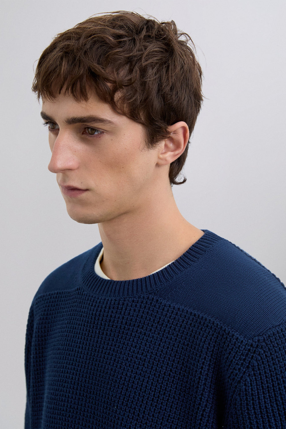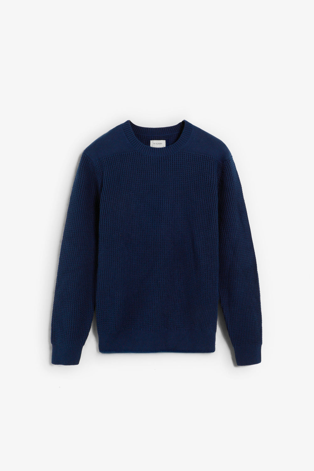 Pull structuré 100 % coton BCI. Coupe droite. Col rond. Manches longues. Étiquette avec logo à l’intérieur.