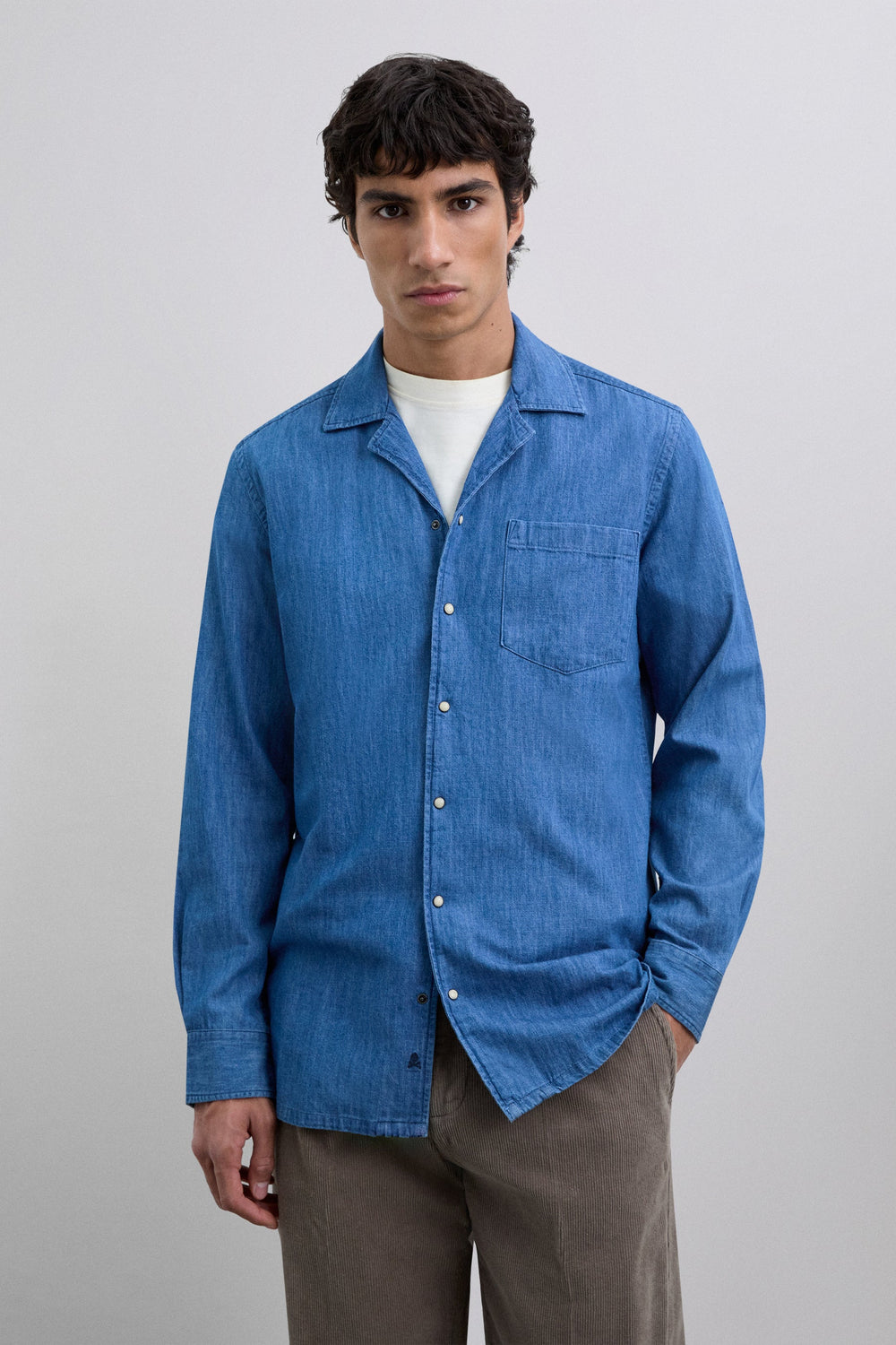 Chemise denim confectionnée en 100 % coton BCI. Coupe droite. Col chemise. Boutonnée devant. Manches longues. Poignets boutonnés. Poche au niveau de la poitrine. Logo brodé sur la patte de boutonnage.