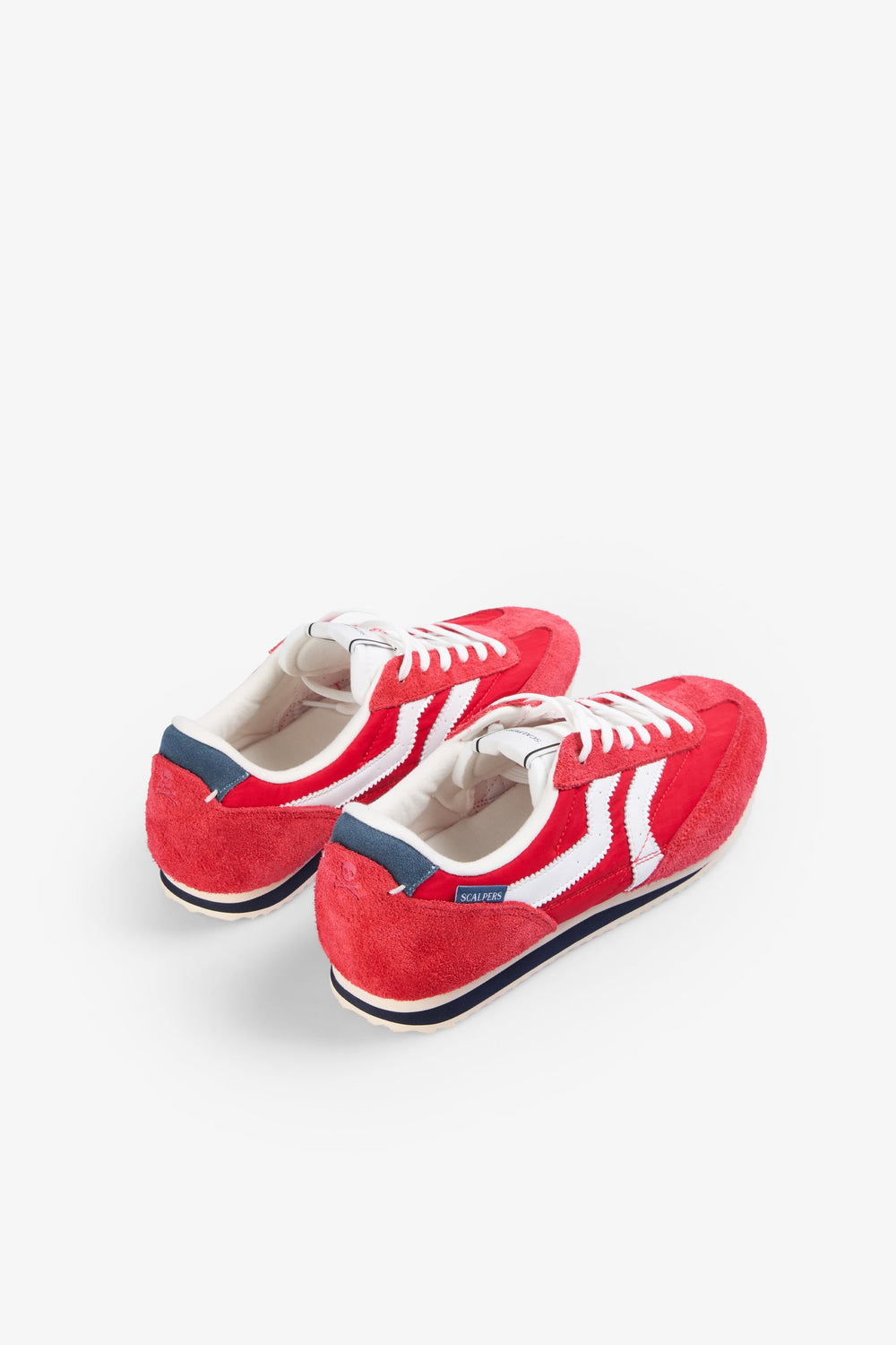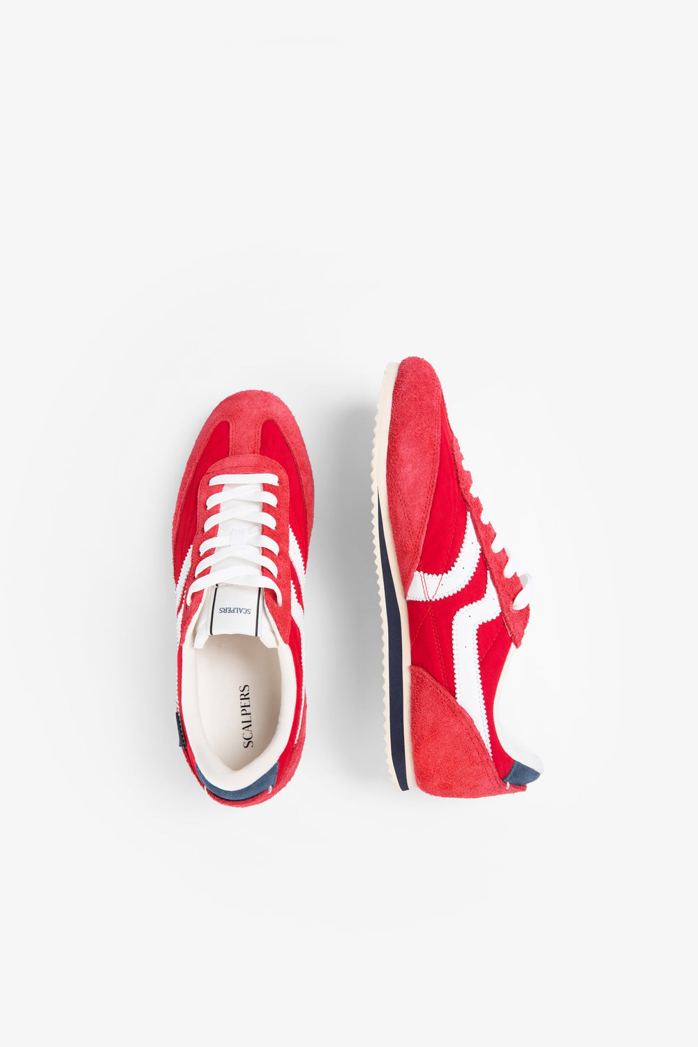 Tennis style rétro. Dessus composé d’une combinaison de pièces en tissu technique et de détails en cuir finition croûte de cuir. Semelle fine à détail contrastant.