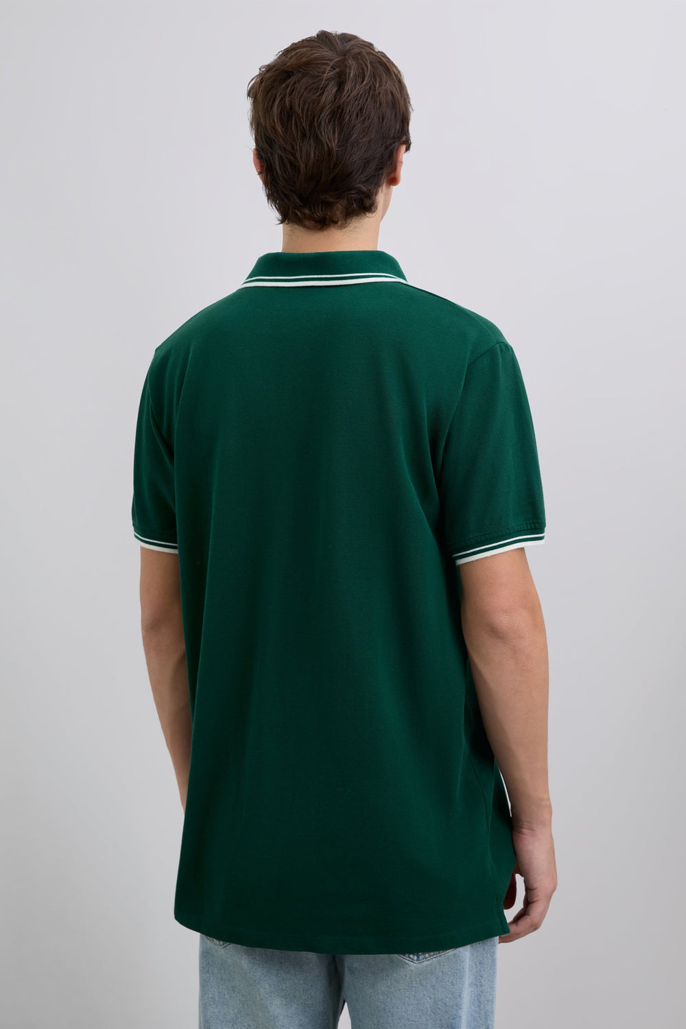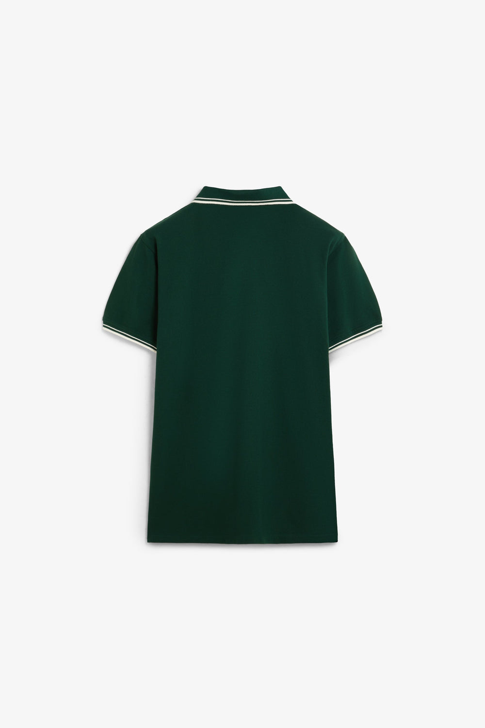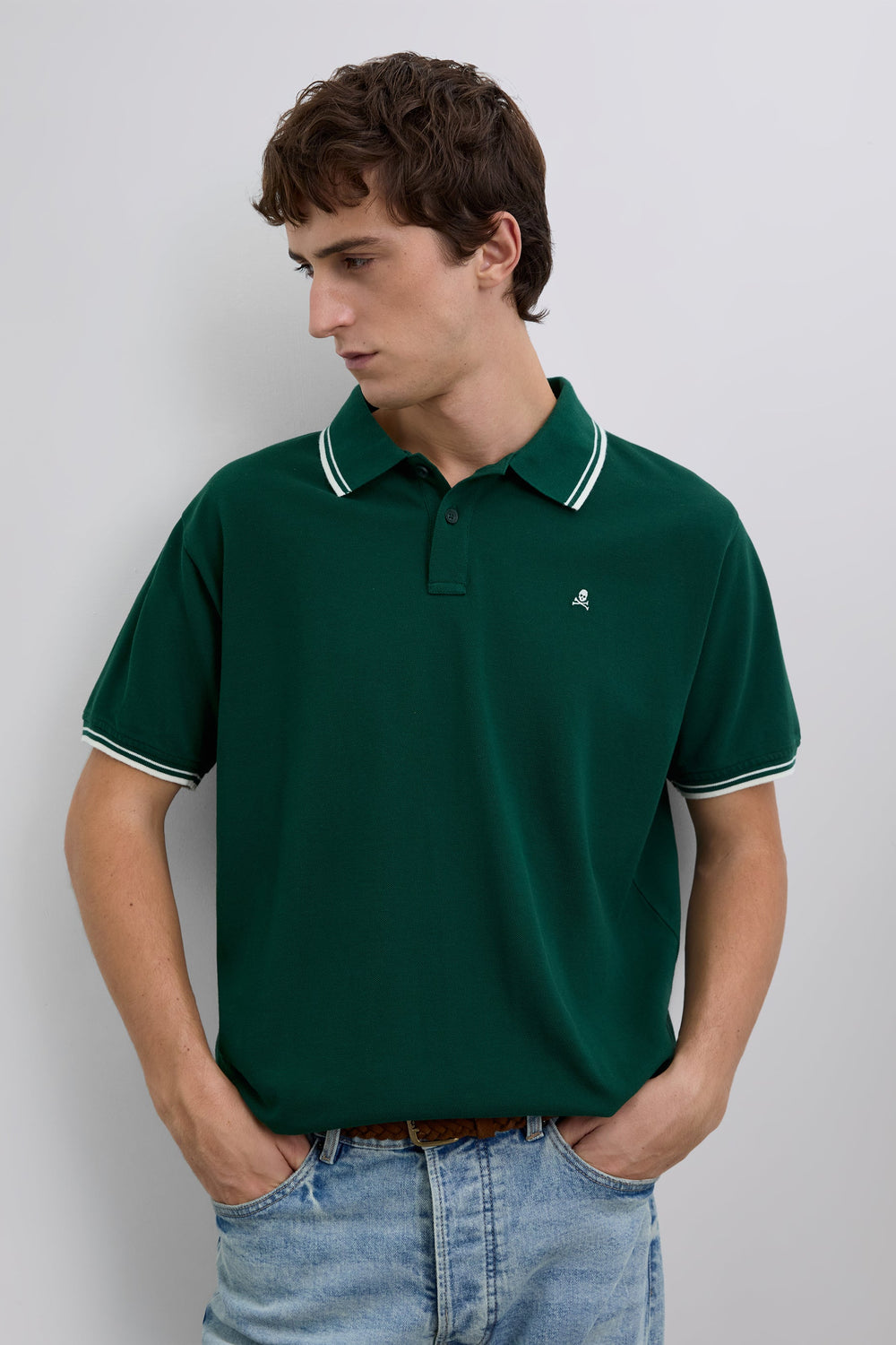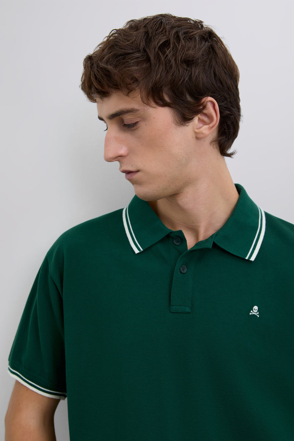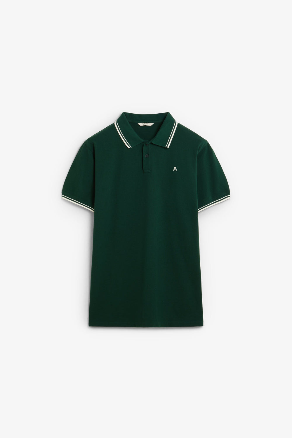 Polo 100 % coton BCI. Manches courtes. Coupe droite. Rayures contrastantes sur le col et les manches. Patte de boutonnage à deux boutons. Skull contrastant brodé sur la poitrine.