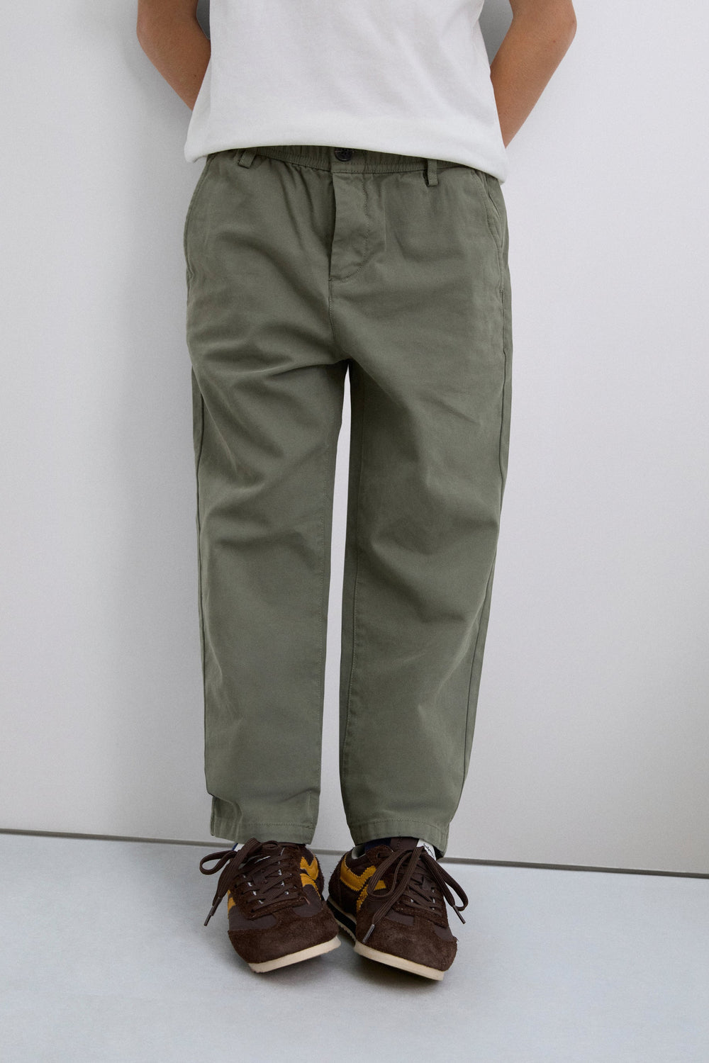 Pantalon chino 100 % coton BCI. Deux poches devant et derrière. Bouton et passants de ceinture. Étiquette avec logo sur la poche.
