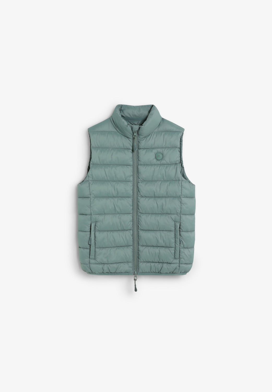 Veste sans manches matelassée en polyester recyclé. Coupe droite. Col montant. Fermeture éclair et poches sur les côtés.