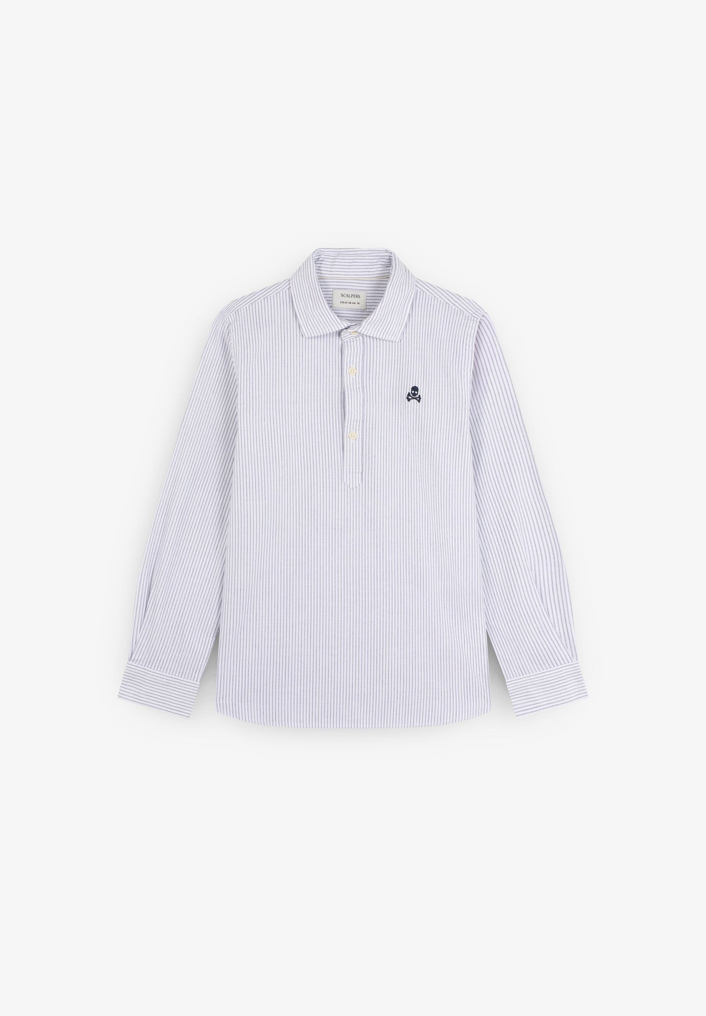 Chemise polo à rayures 100 % coton BCI. Col italien, boutons, coupe droite, skull contrastant sur la poitrine. Poignets boutonnés.