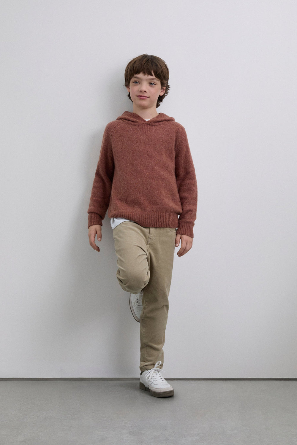 Pull en maille à capuche confectionné dans un mélange de laine tweed. Manches longues. Skull contrastant brodé dans le bas.