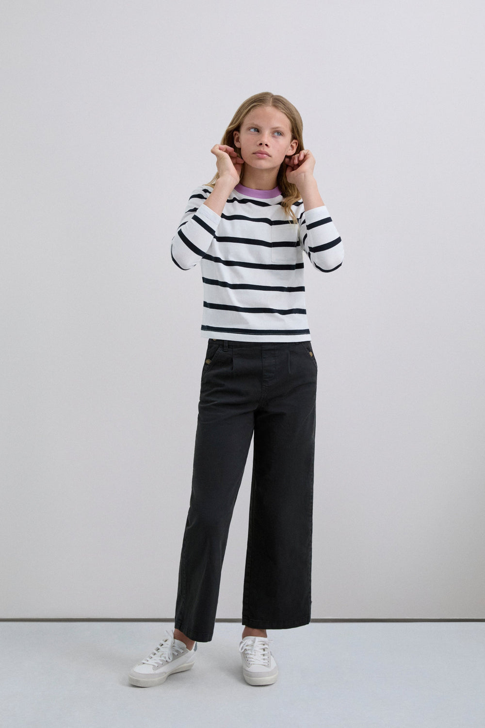 T-shirt à rayures 100 % coton BCI. Coupe droite, col rond contrastant et manches longues. Poche sur la poitrine et étiquette avec logo dans le dos.
