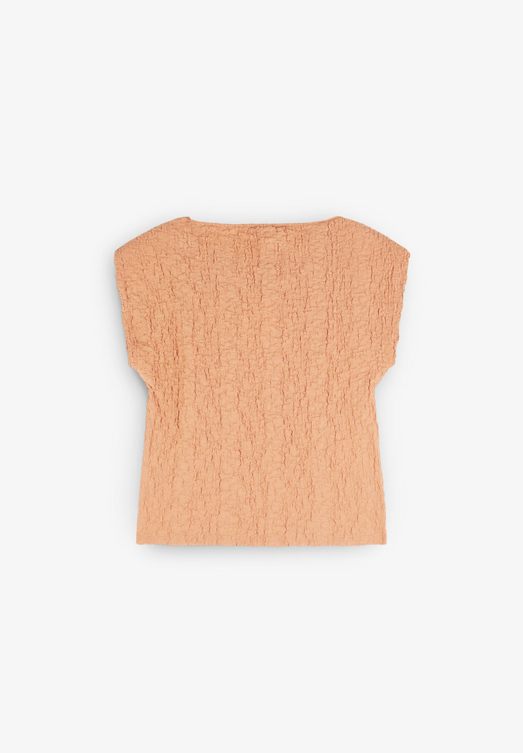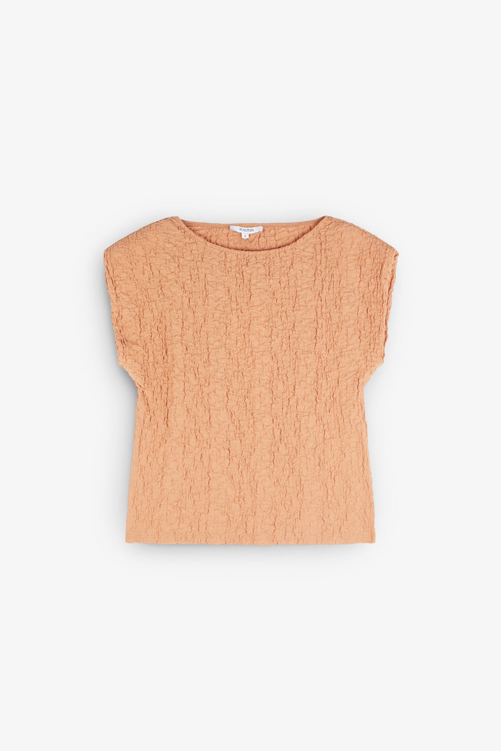 T-shirt confectionné dans un mélange de coton légèrement extensible à texture crinkle. Coupe slim, col rond et manches courtes à petites épaulettes.