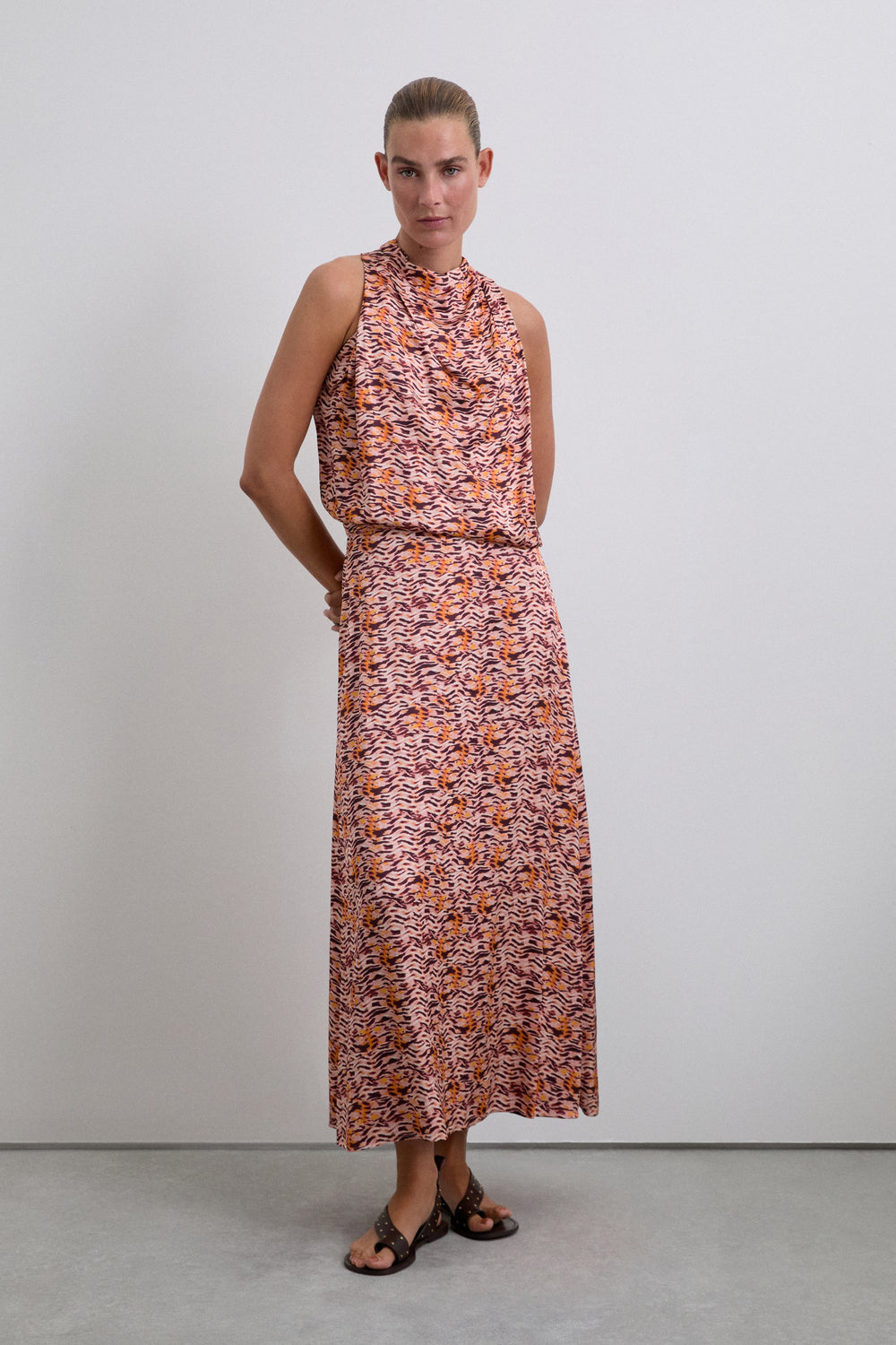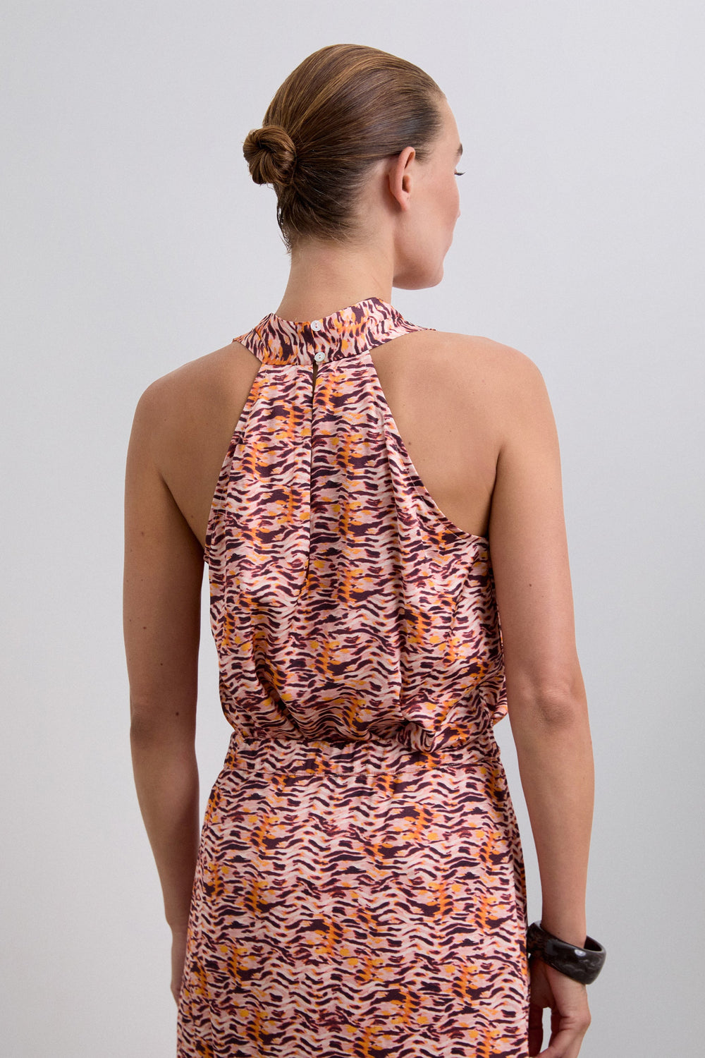 Top à emmanchures américaines. Sans manches. Détail imprimé. Boutonné sur la nuque.
