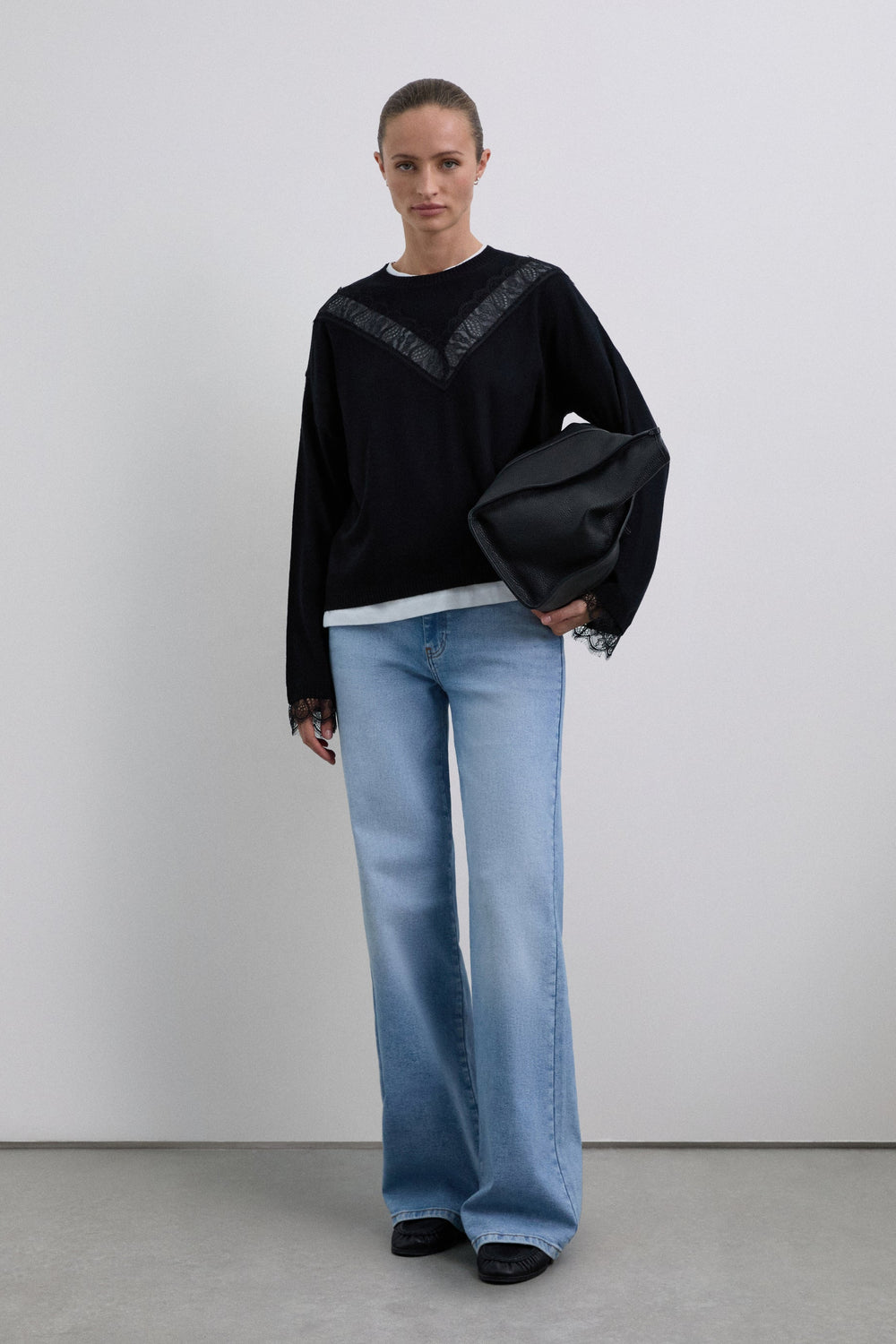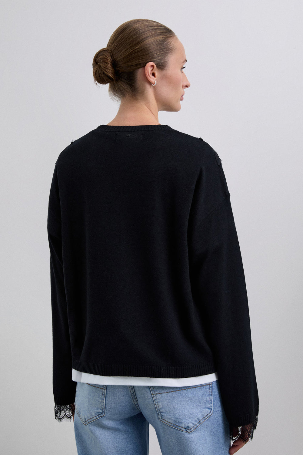 Pull confectionné dans un mélange de laine et de viscose. Coupe droite. Col rond et manches longues à finition bord-côte. Détails en dentelle sur la poitrine et le bas des manches.