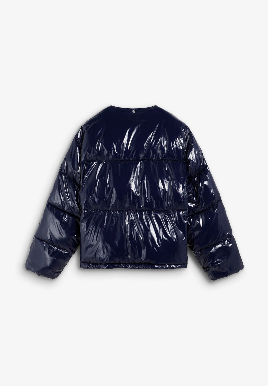 Doudoune en nylon à finition brillante. Coupe droite. Col montant. Manches longues. Poches latérales sur les côtés. Boutons-pression.