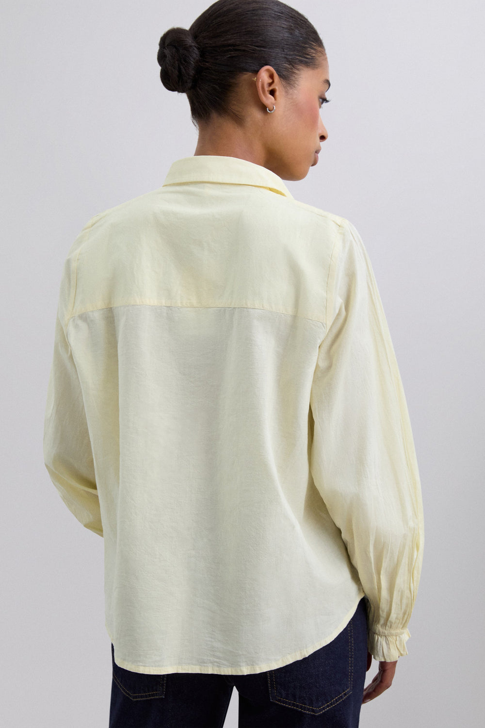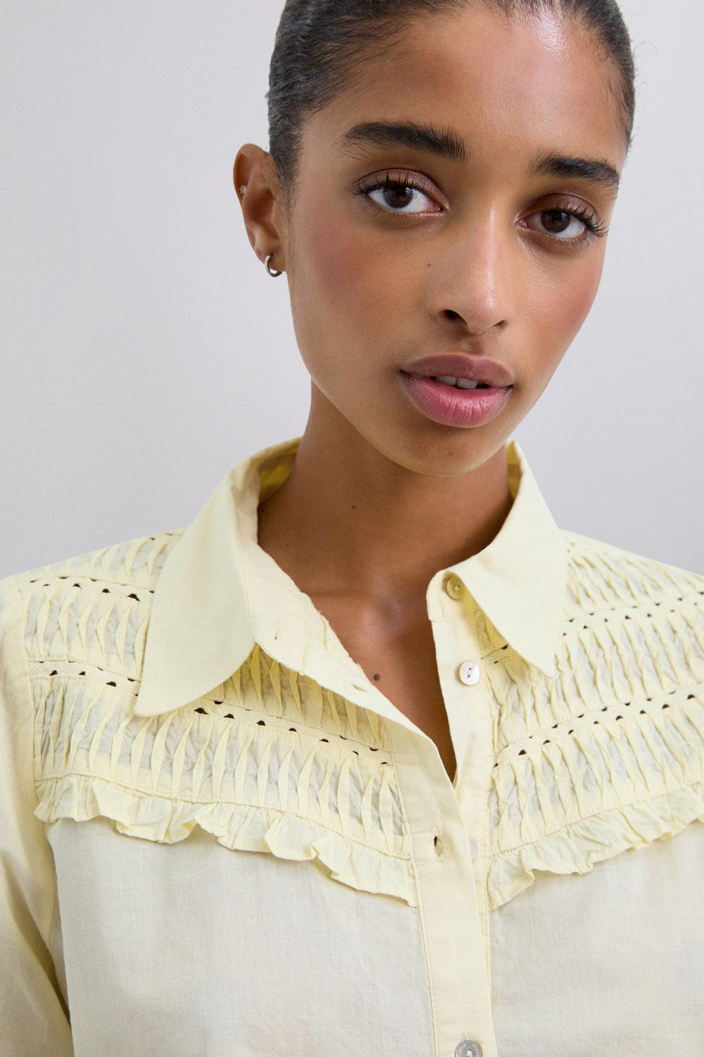 Chemisier 100 % coton. Coupe droite. Col italien. Empiècement sur la poitrine. Manches longues à poignets élastiques avec un petit volant. Fermeture boutonnée.