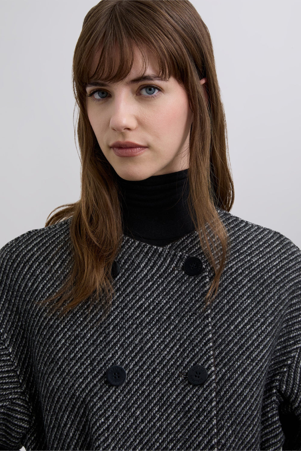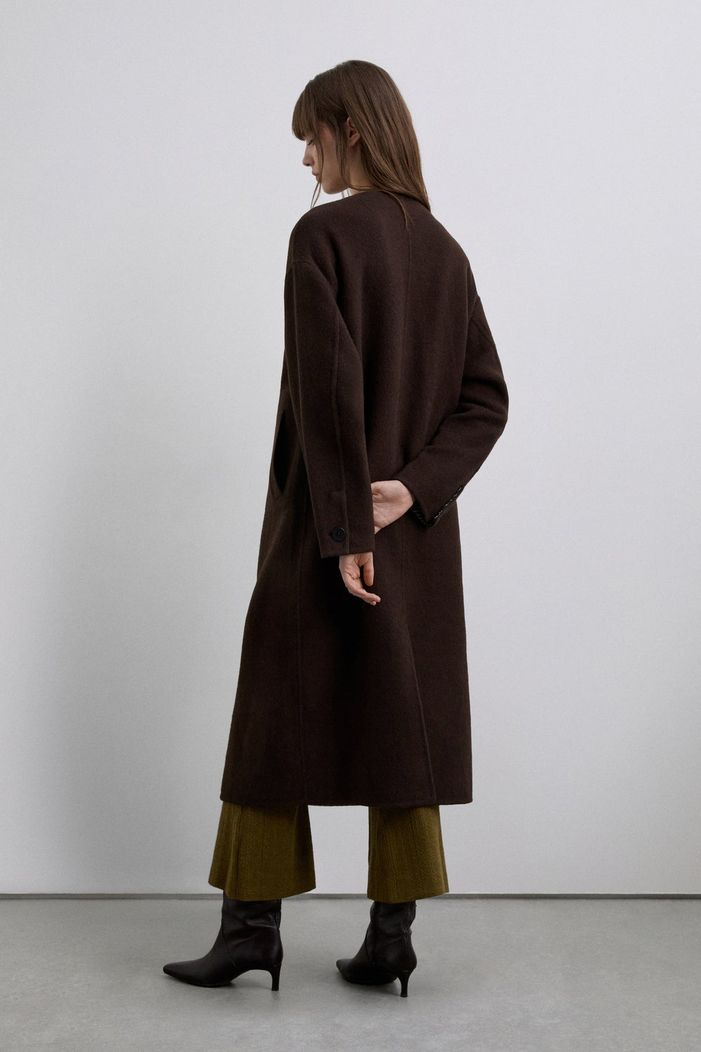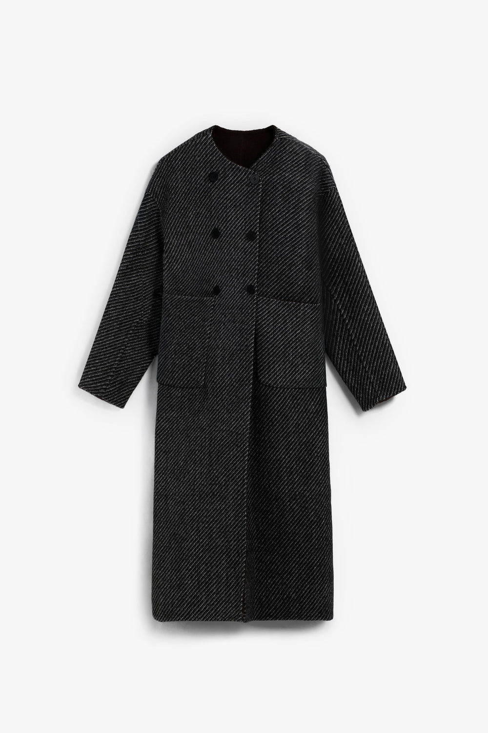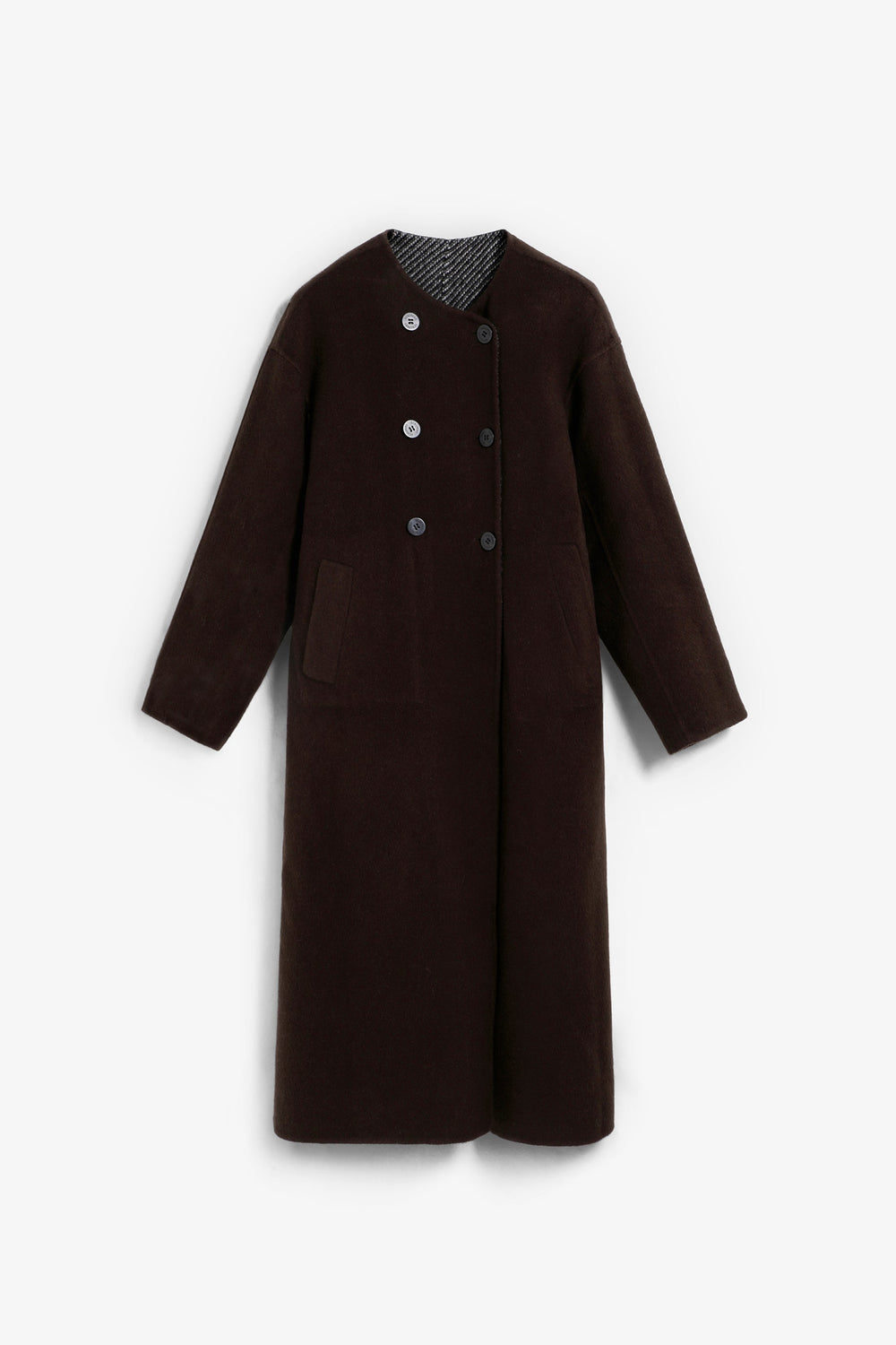 Manteau long réversible confectionné dans un mélange de laine. Coupe droite. Col rond sans revers. Un côté imprimé herringbone gris et un côté uni marron. Poches plaquées côté herringbone et poches en biais côté uni.