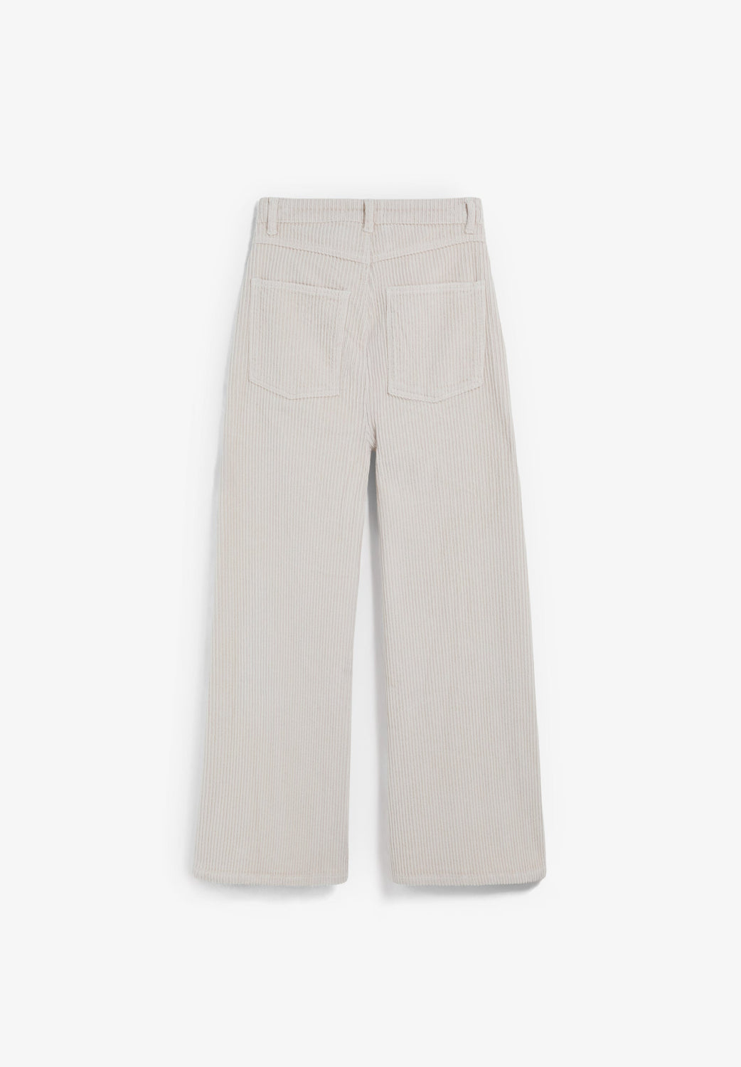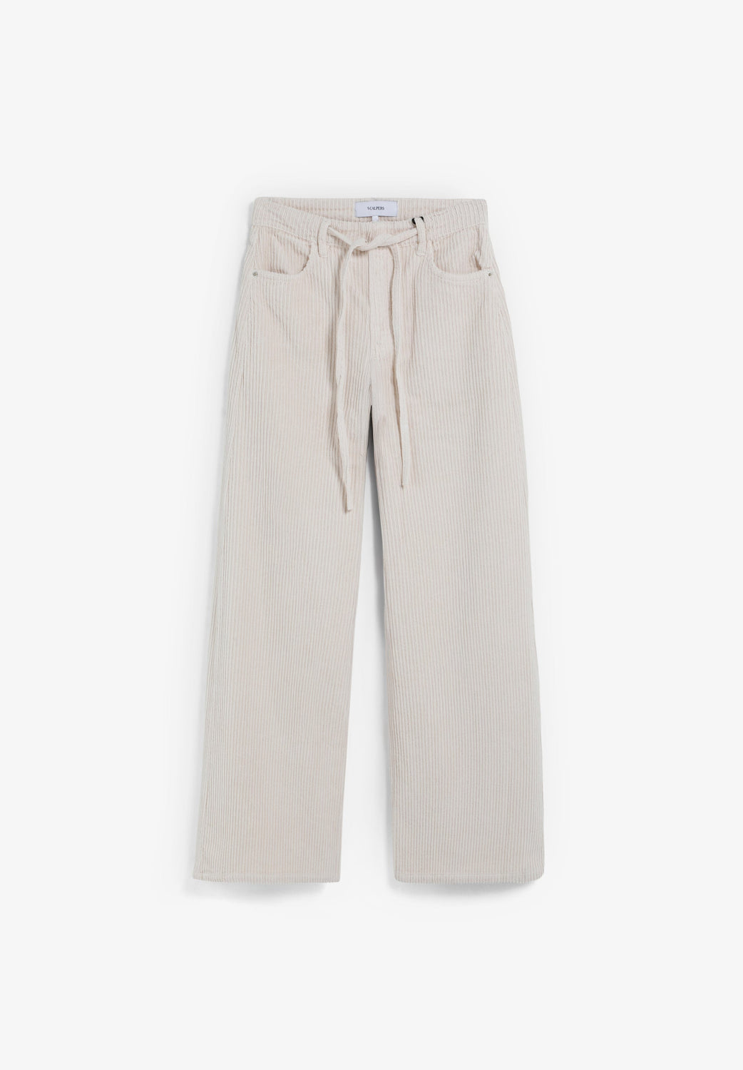 Pantalon en coton BCI. Full length. Effet velours côtelé. Cordon de serrage assorti à la taille. Poches sur les côtés et derrière.