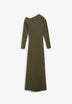 Knit dress made of cotton. Asymmetric neckline. Long adjustable sleeves. The dress is fitted at the waist and hem. Pleats from shoulder to waist. Ruched side slit