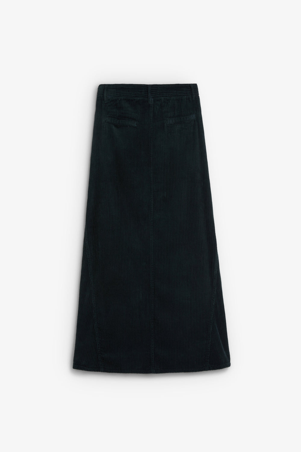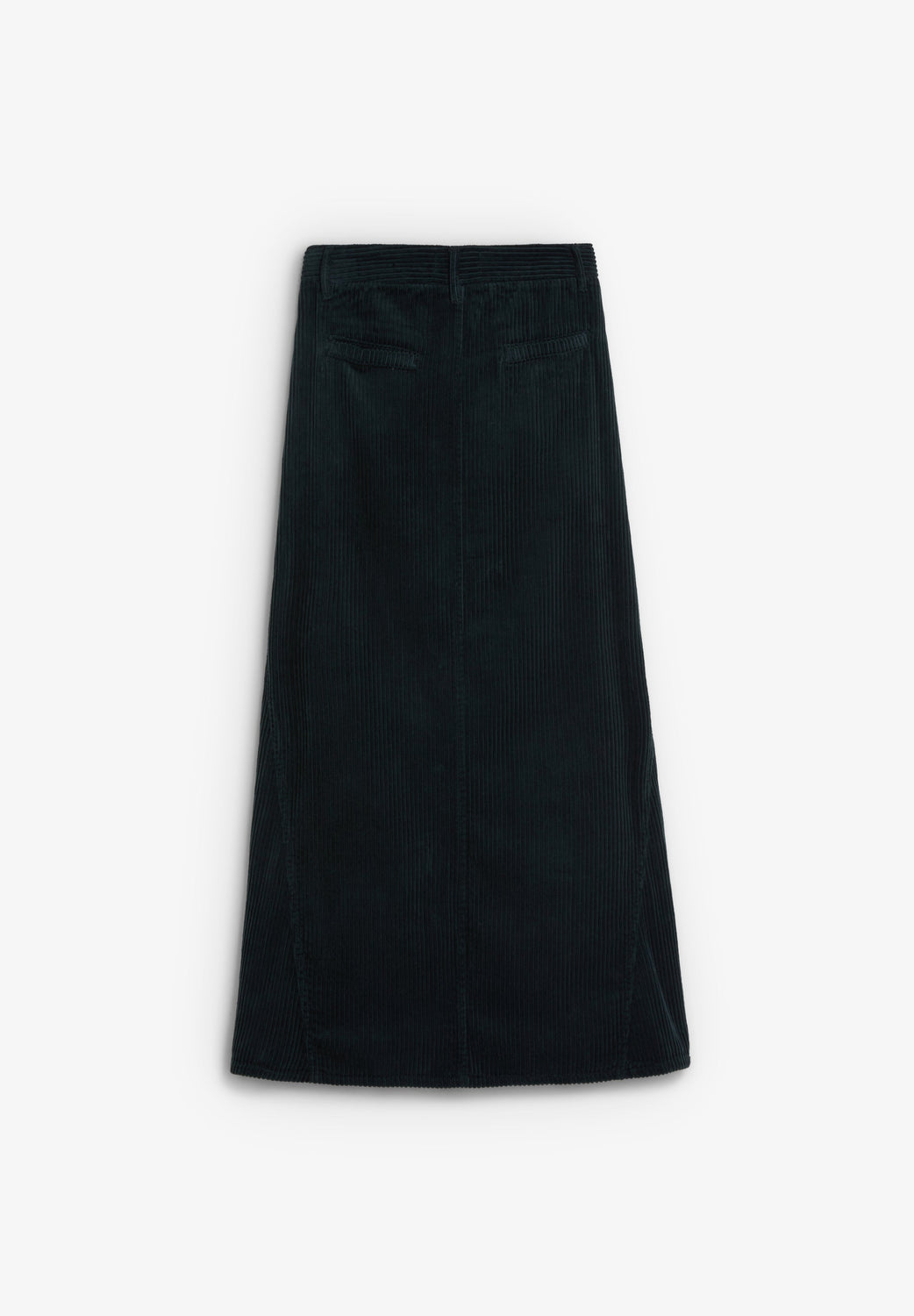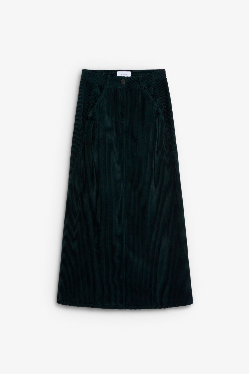 Jupe en velours côtelé en coton. Poches devant. Fermeture avec poches et bouton. Longueur midi. Passants de ceinture.