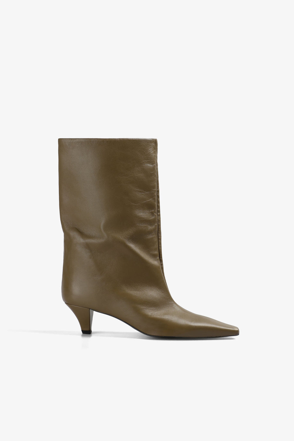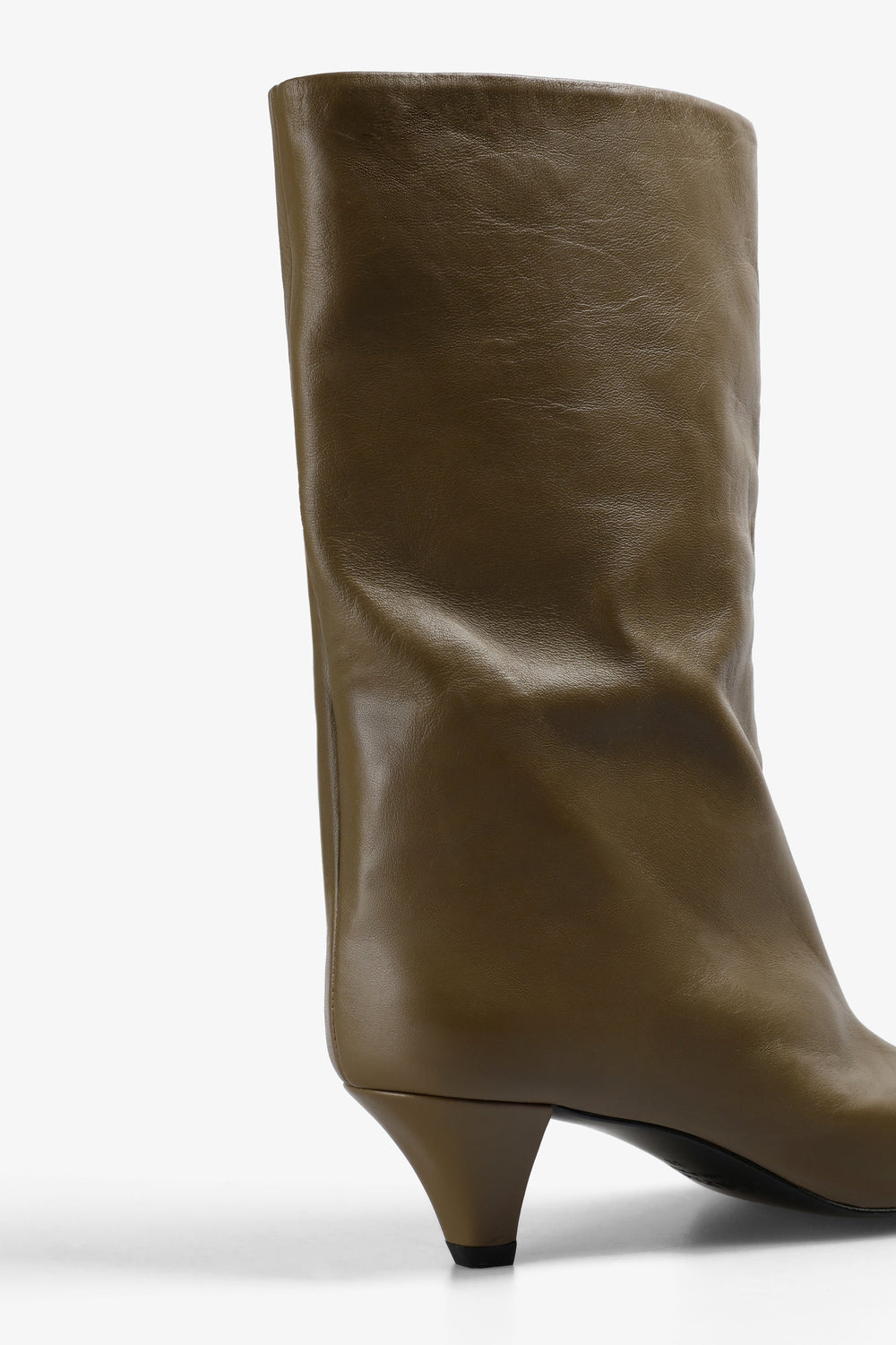 Bottes 100 % cuir. Tige froncée. Petit talon fin moyen. Bout pointu.