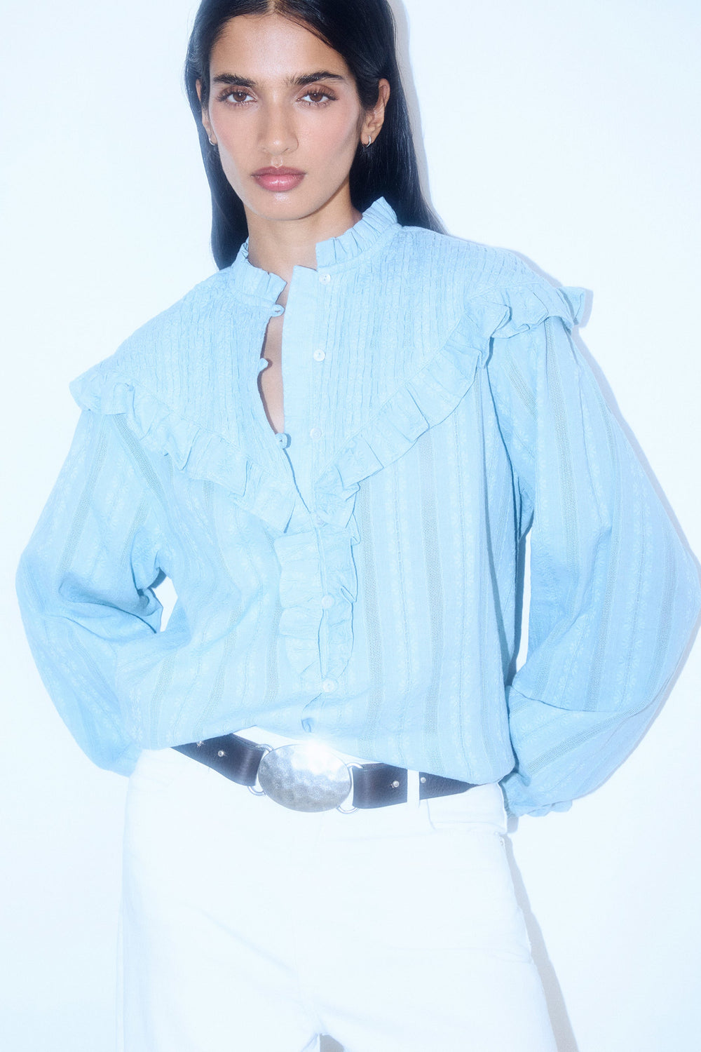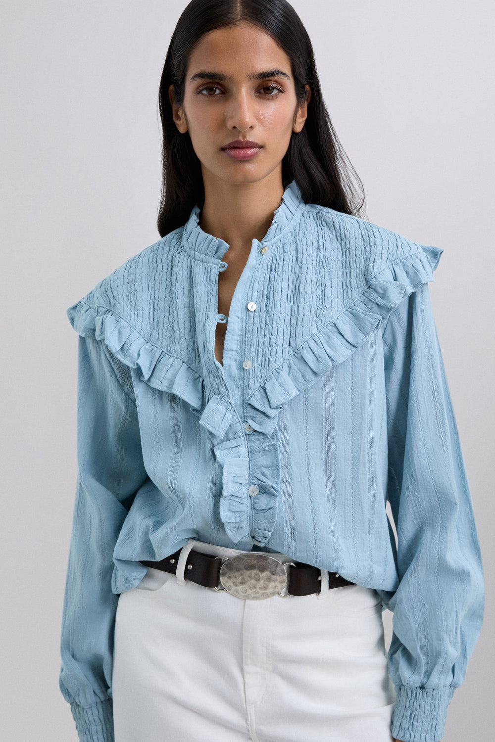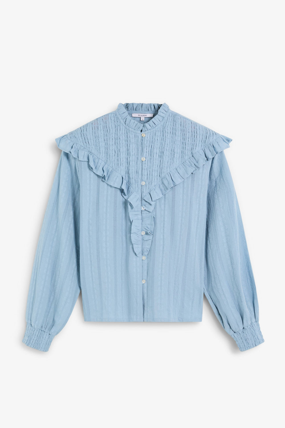 Chemisier à manches longues 100 % coton. Col classique et volant en nid d’abeille. Boutons nacrés.