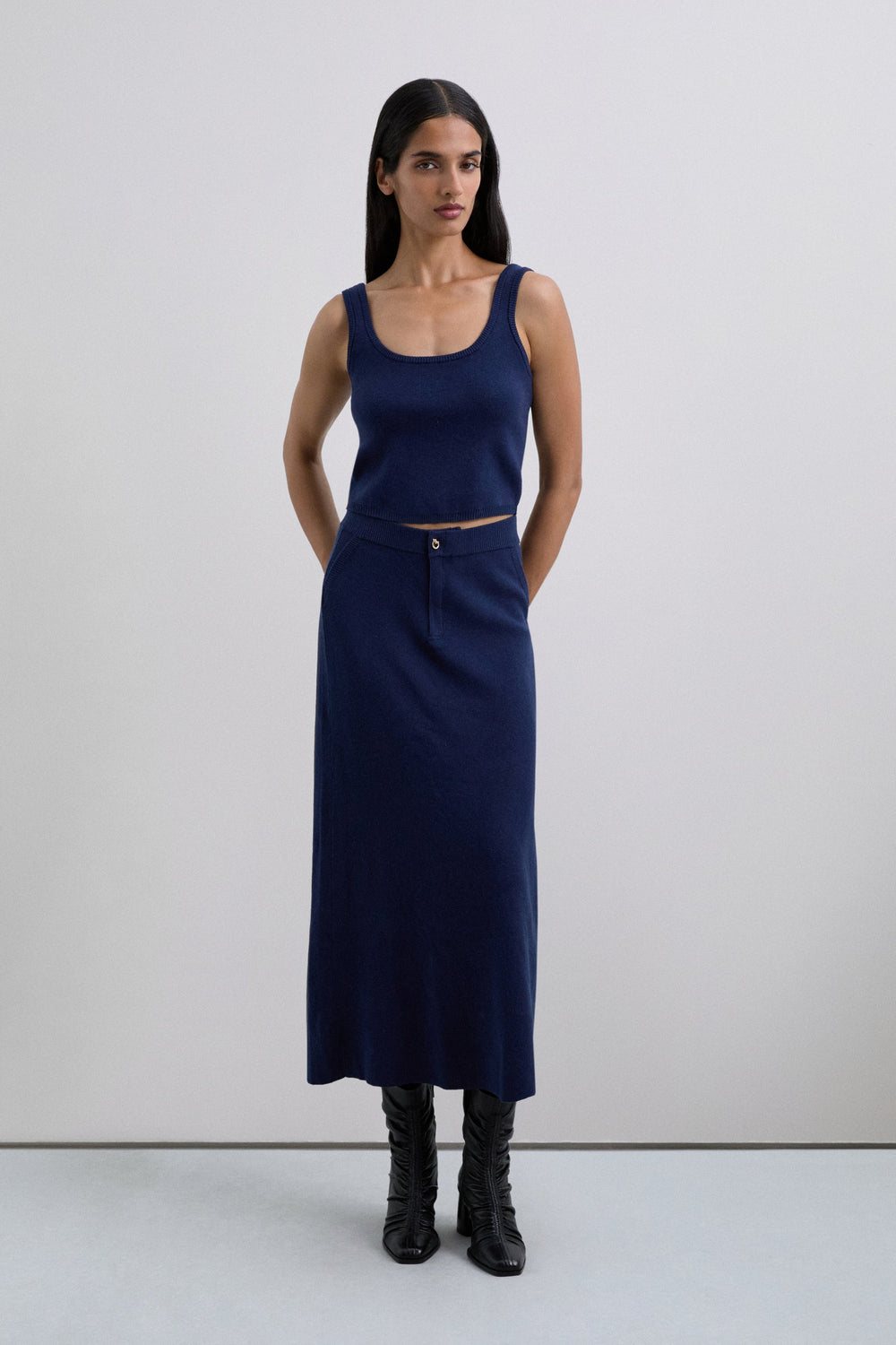 Jupe longue en maille confectionnée dans un mélange de coton. Coupe midi. Bouton de fermeture. Taille élastique à finition bord-côte.