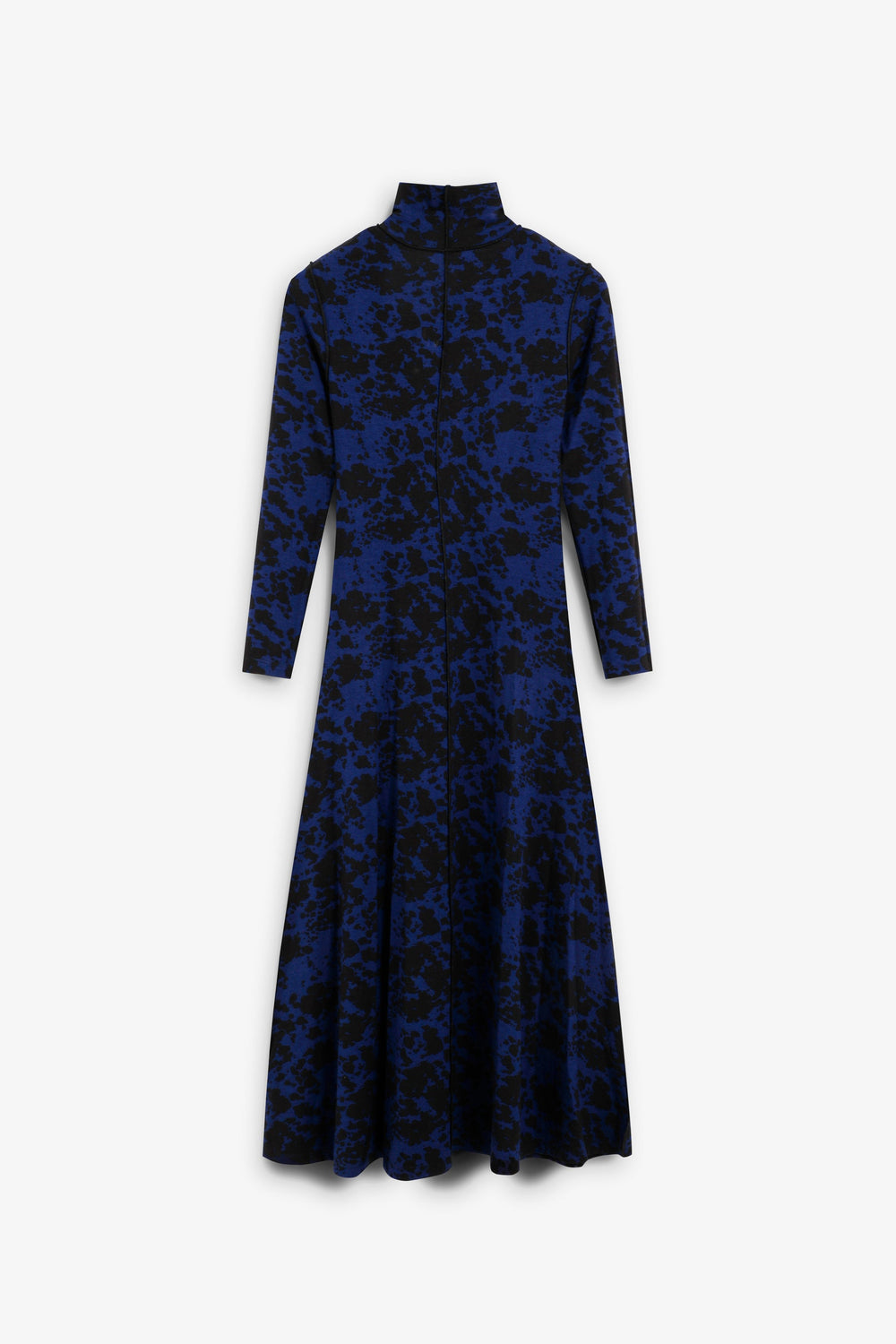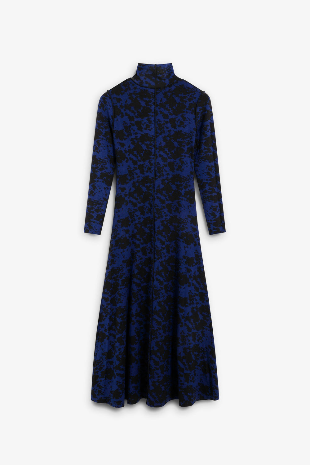 Robe midi confectionnée en viscose légèrement extensible. Imprimé motif animal, col montant et manches longues. Coutures apparentes.