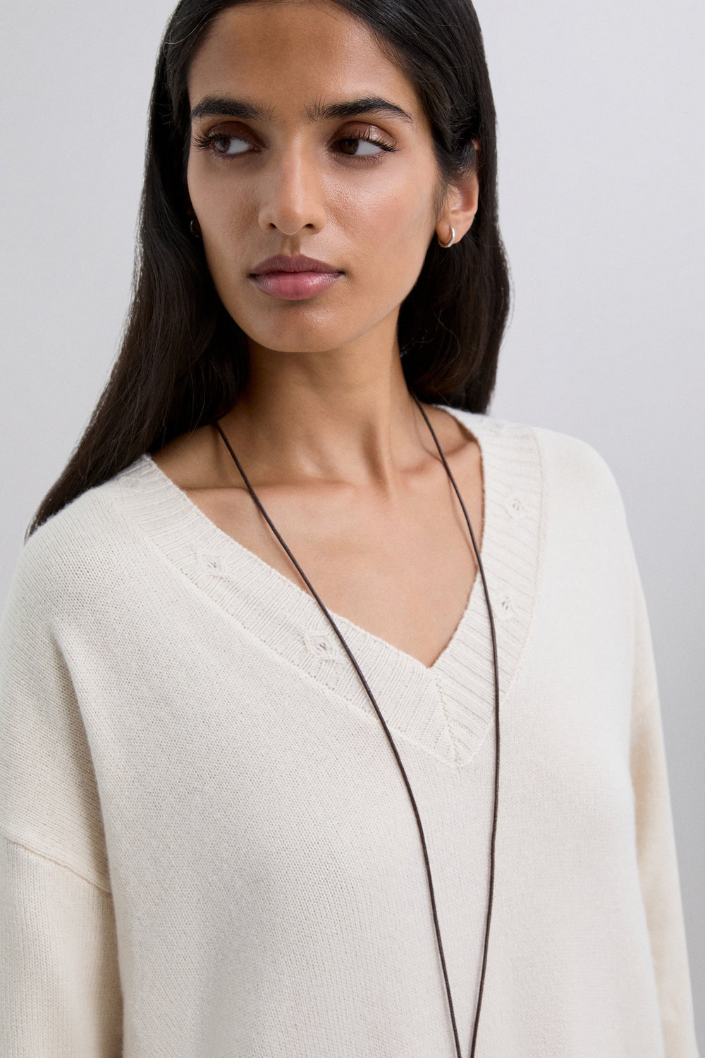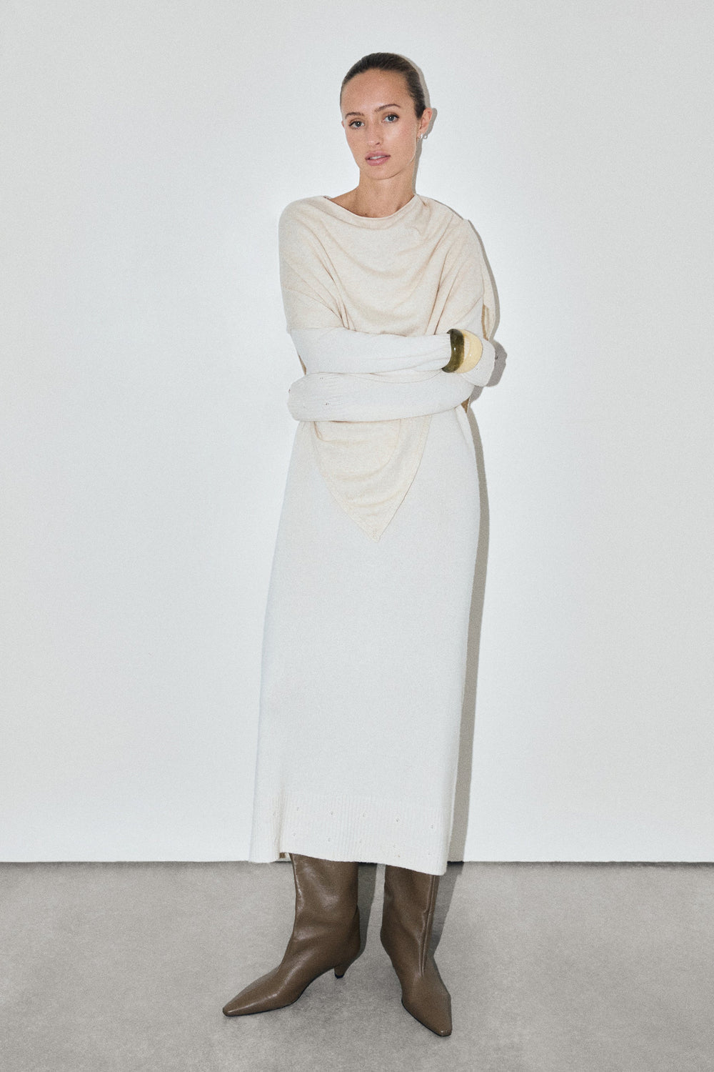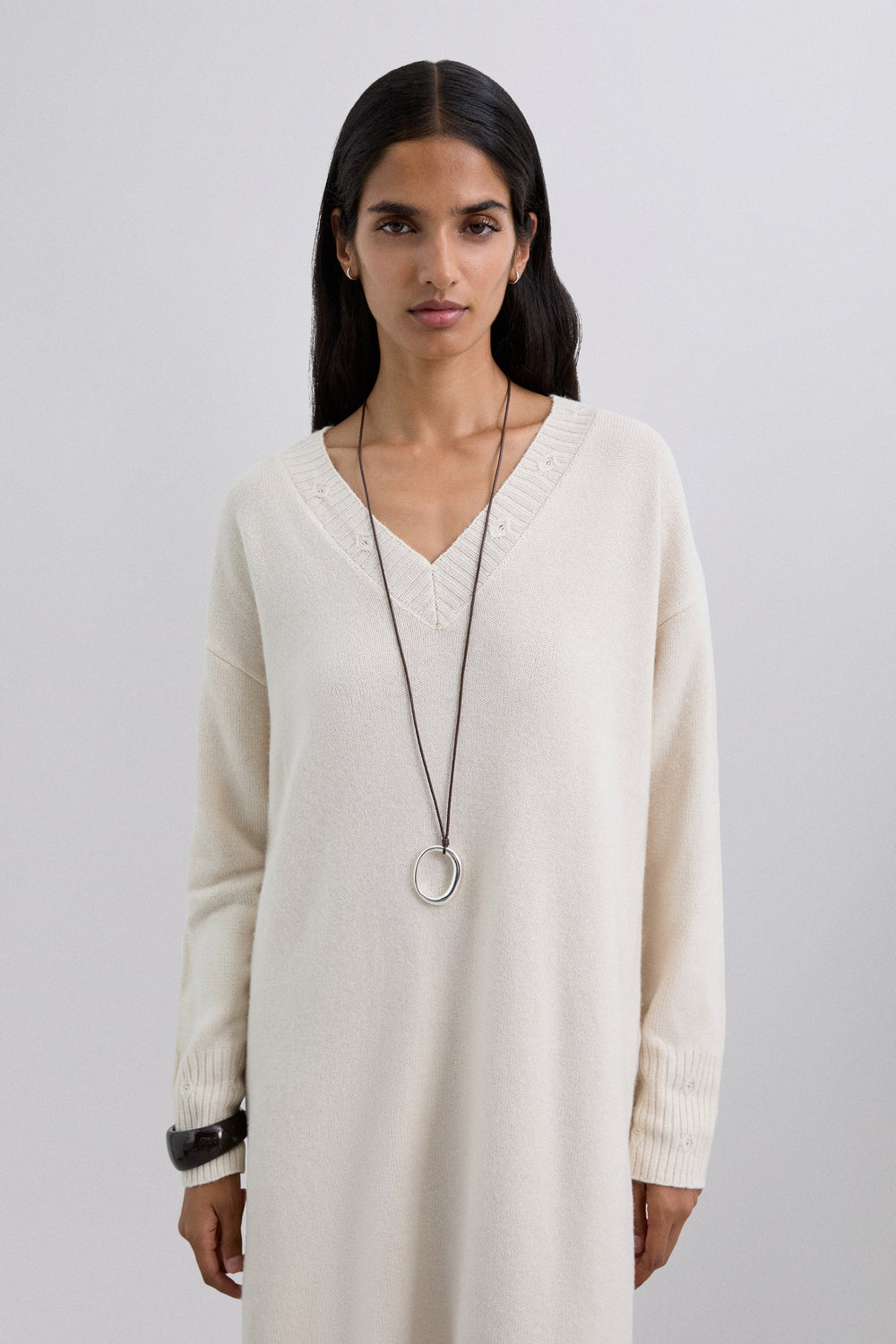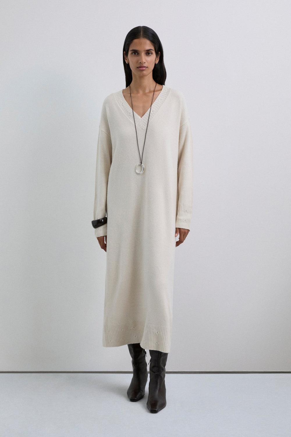 Robe confectionnée dans un mélange de laine et de viscose. Robe midi à décolleté en V et manches longues. Finition en bord-côte à l’encolure, aux poignets et dans le bas avec des détails de nuisette marron et noire.