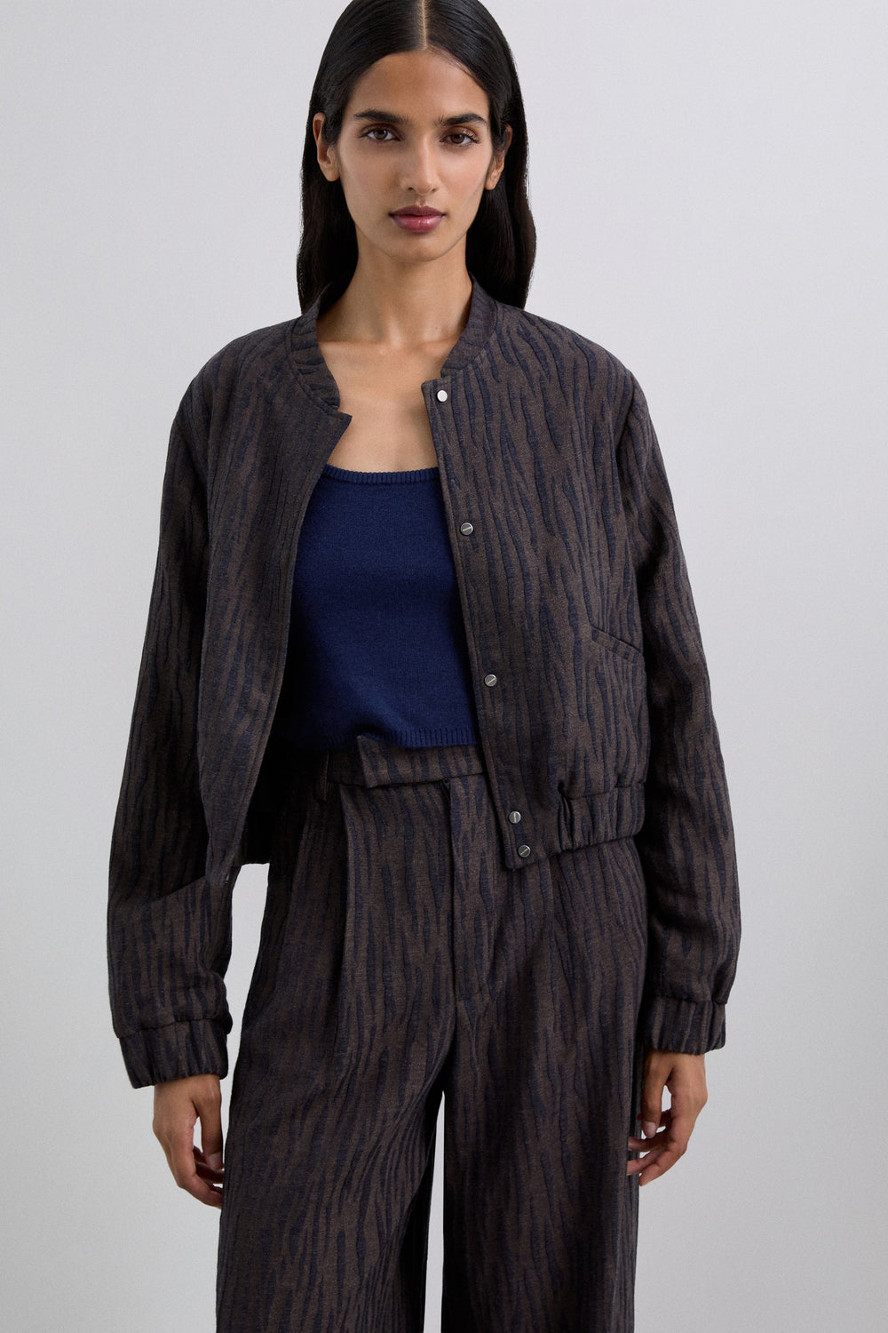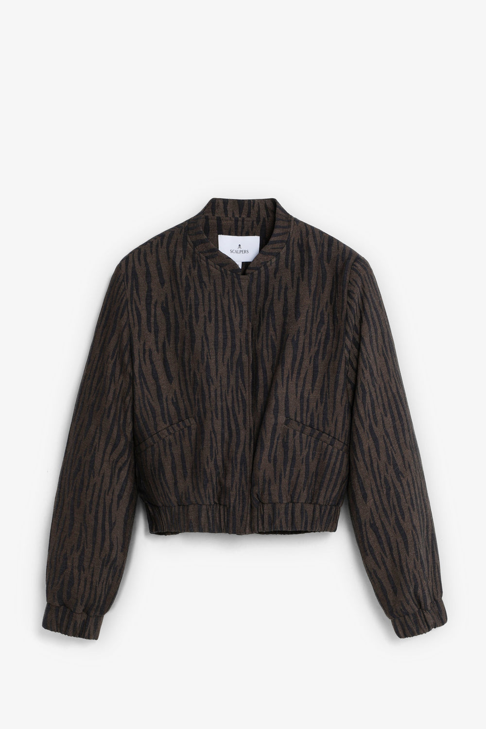 Veste bomber à imprimé motif animal. Manches longues. Poignets et taille légèrement élastiques. Fermeture boutonnée devant. Poches sur le devant.
