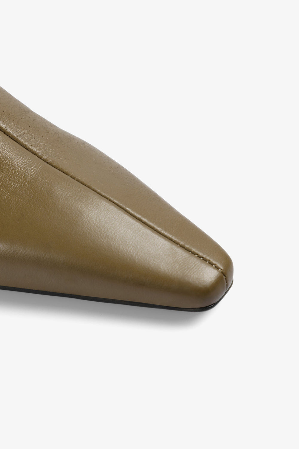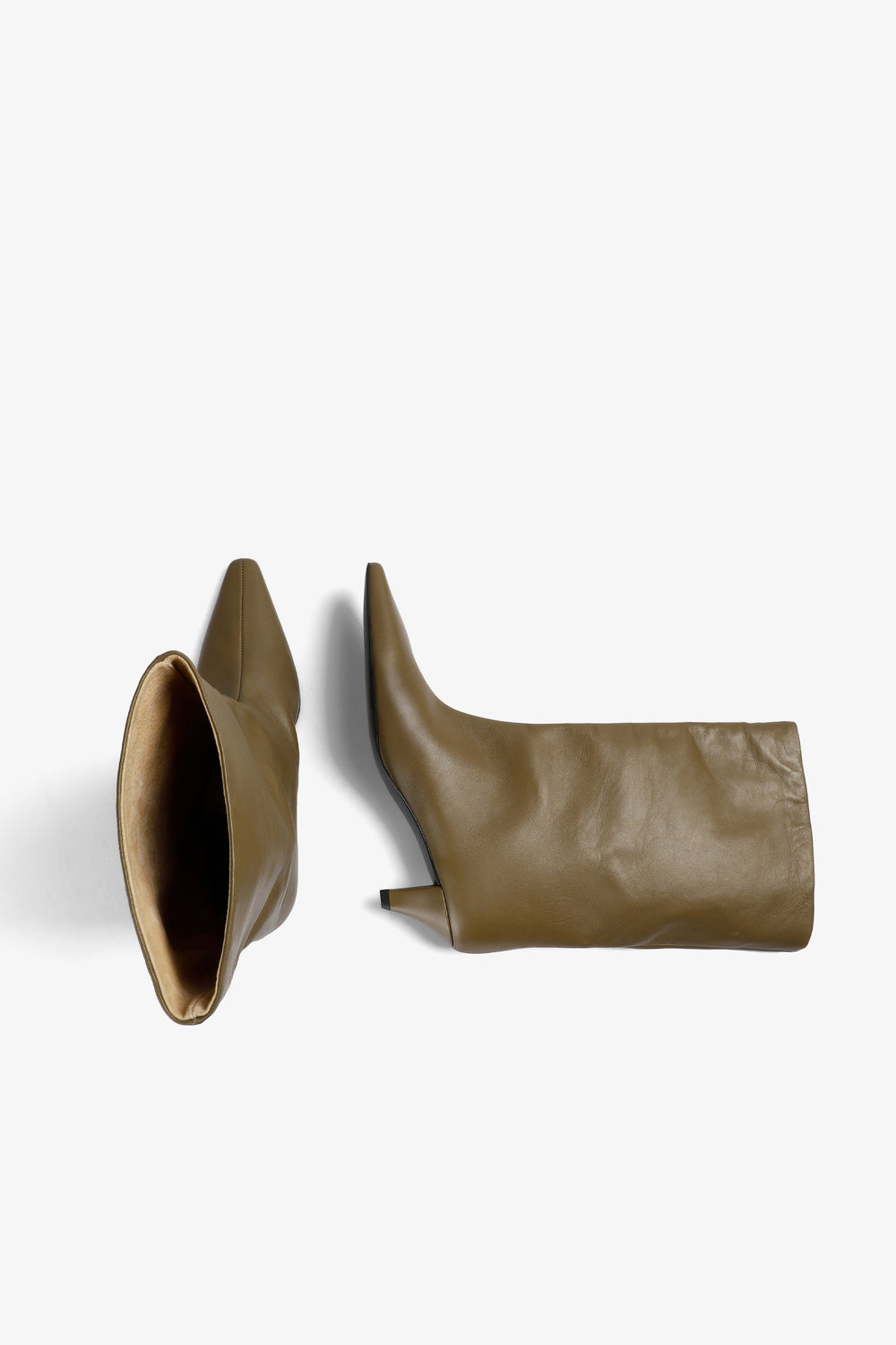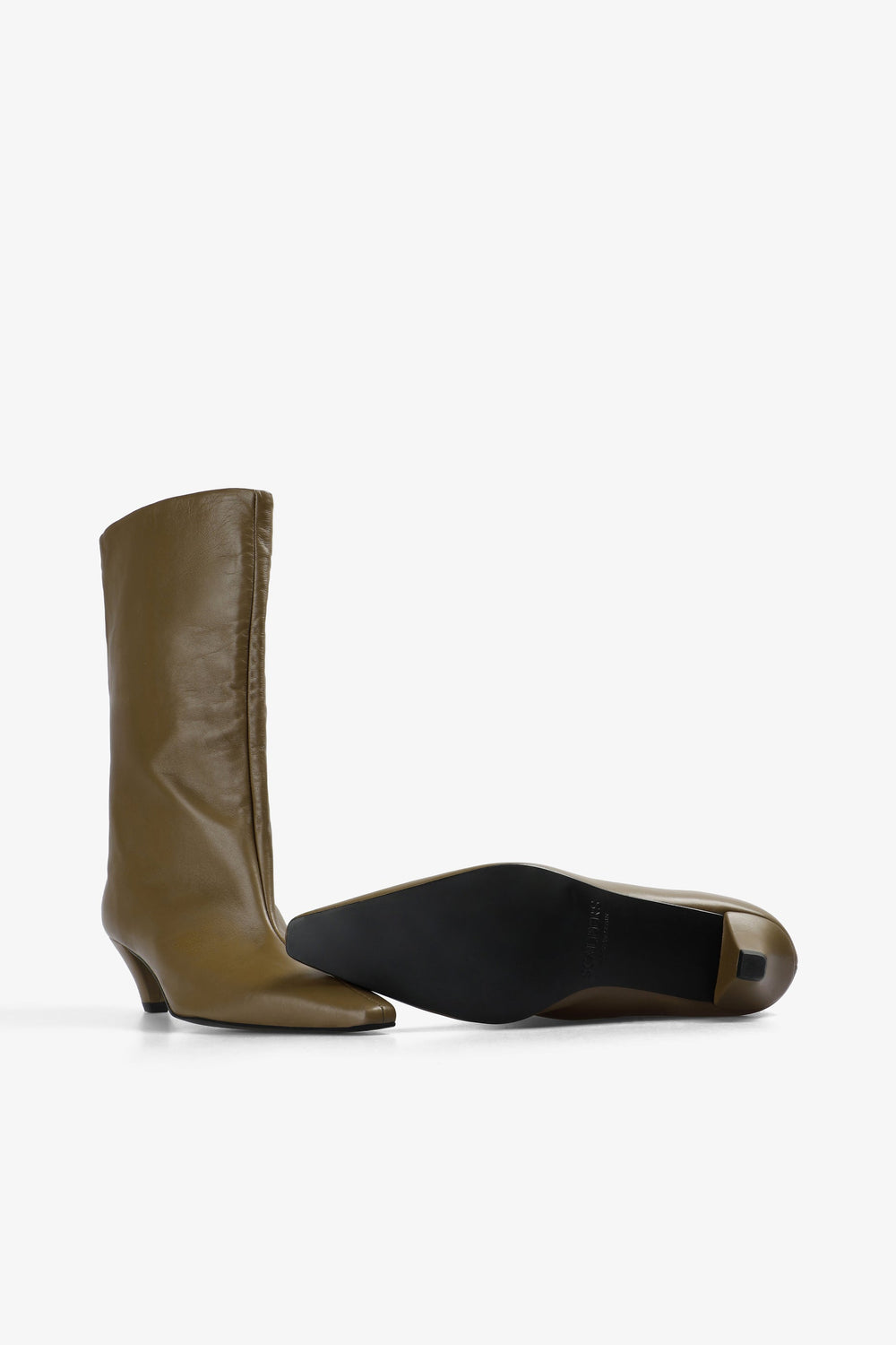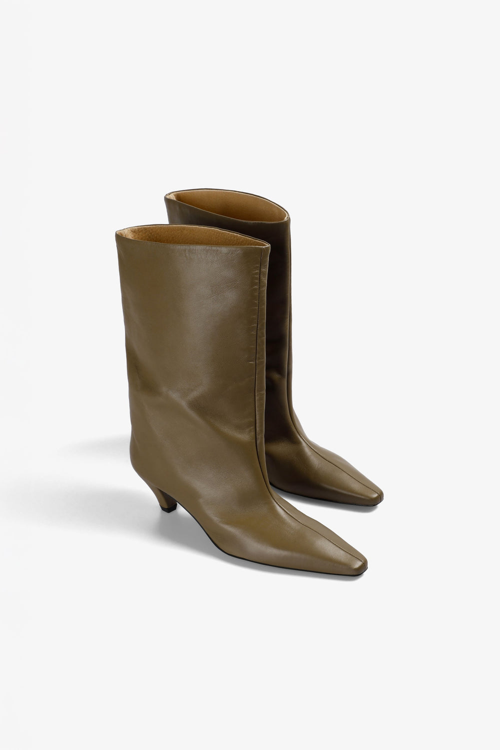 Bottes 100 % cuir. Tige froncée. Petit talon fin moyen. Bout pointu.