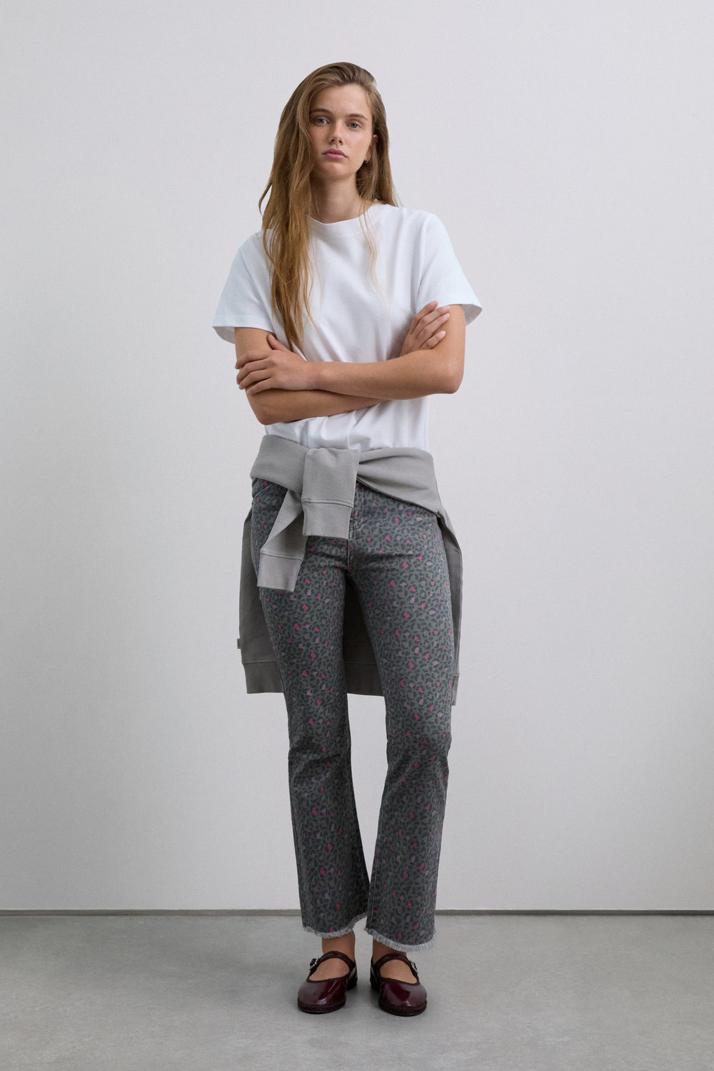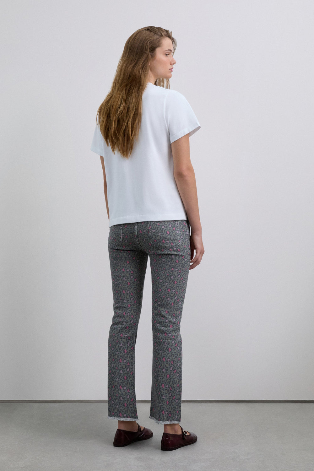 Jean. Deux poches sur le devant. Deux poches arrière avec étiquette avec logo et skull. Effet effiloché dans le bas. Passants de ceinture. Bouton et fermeture Éclair. Motif animal.