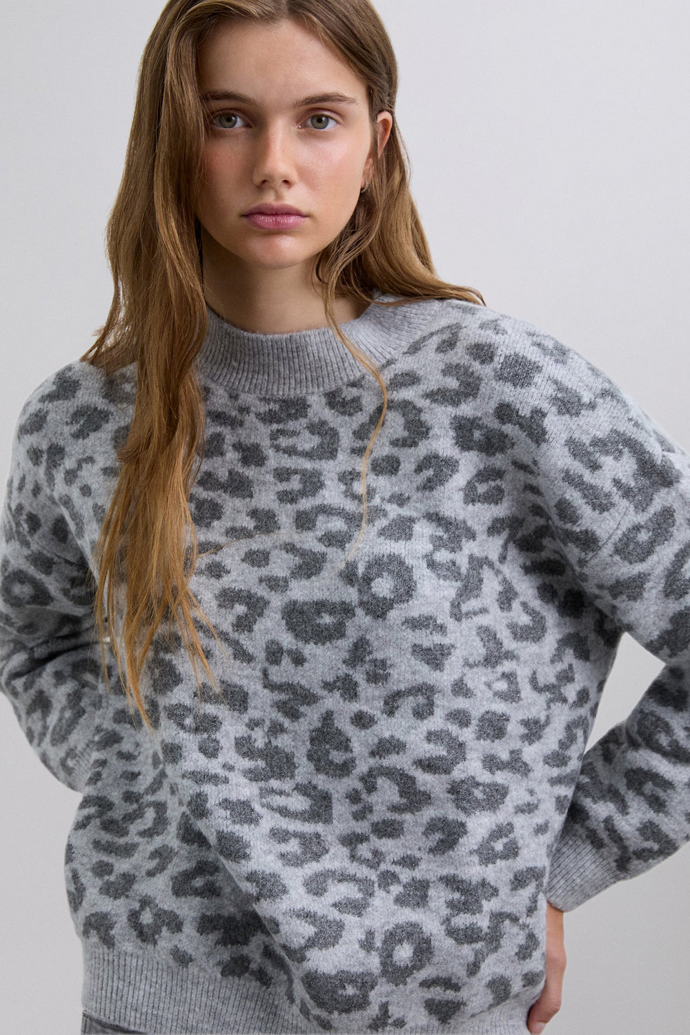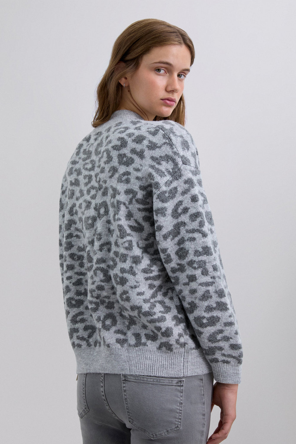 Jersey de punto. Manga larga. Cuello redondo. Estampado animal print. Acabados en rib a contraste.