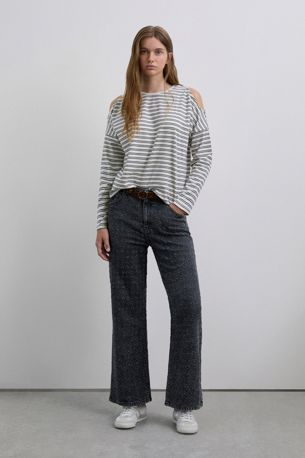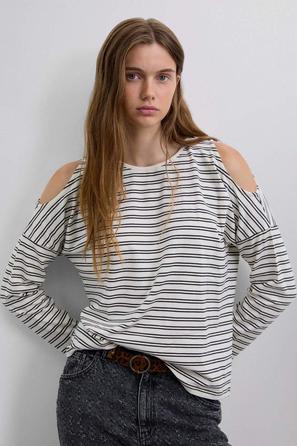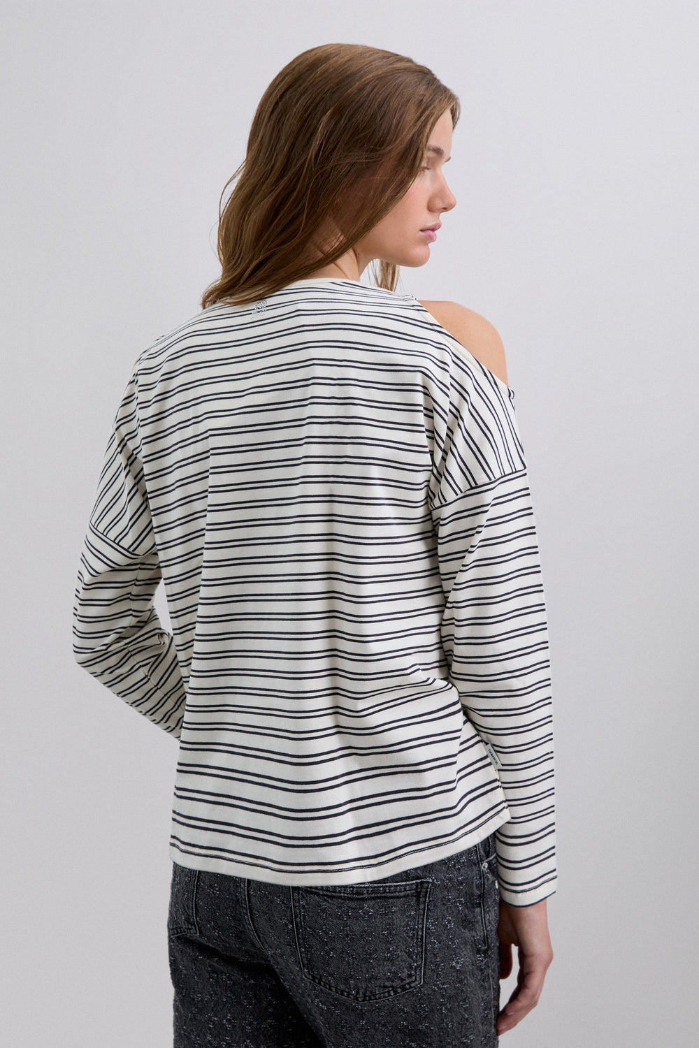 T-shirt en coton BCI. Coupe droite. Imprimé rayé. Col rond. Manches longues avec ouvertures sur les épaules. Skull en strass dans le dos.