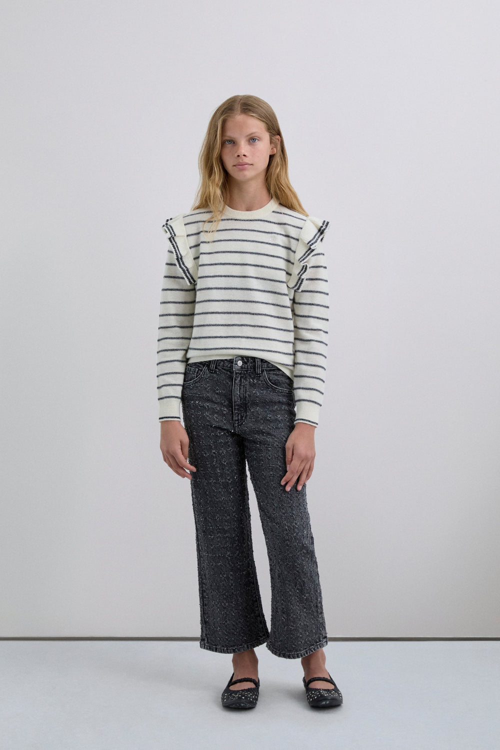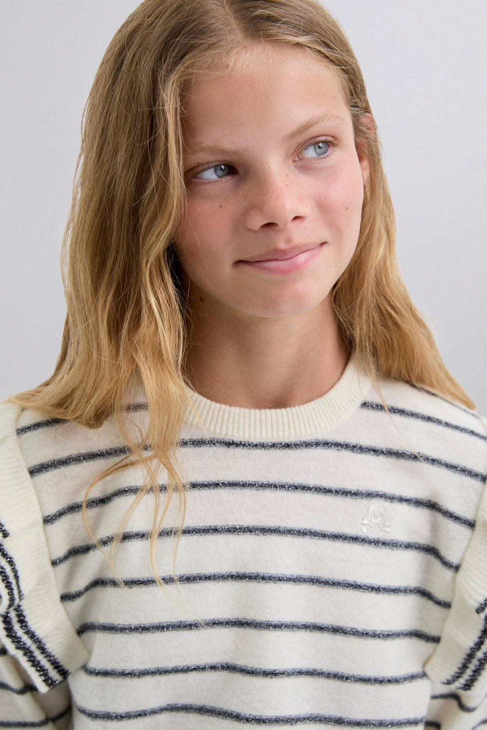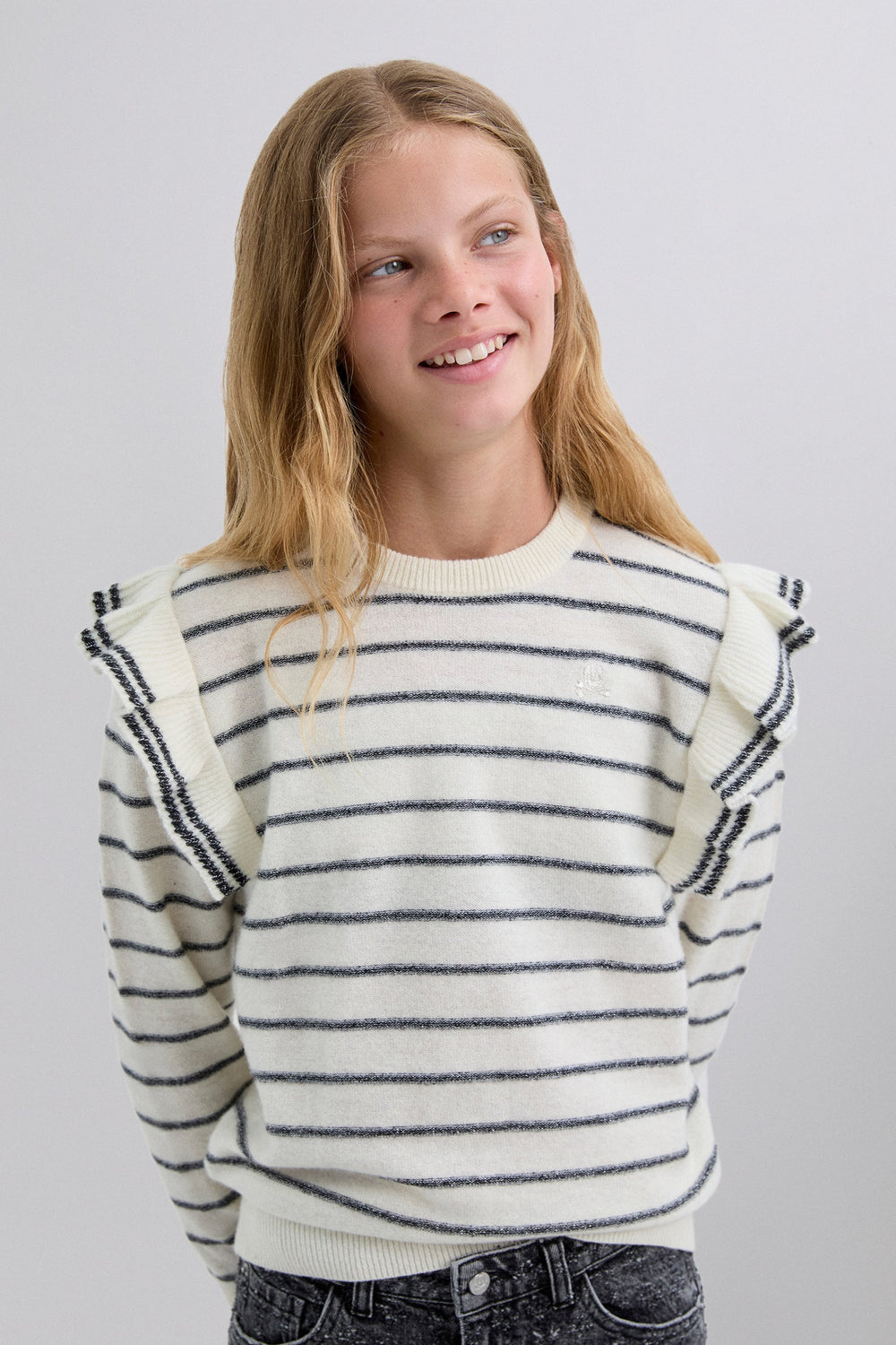Pull à rayures en maille confectionné dans un mélange de laine. Col rond. Coupe droite. Volants sur les épaules et logo sur la poitrine.