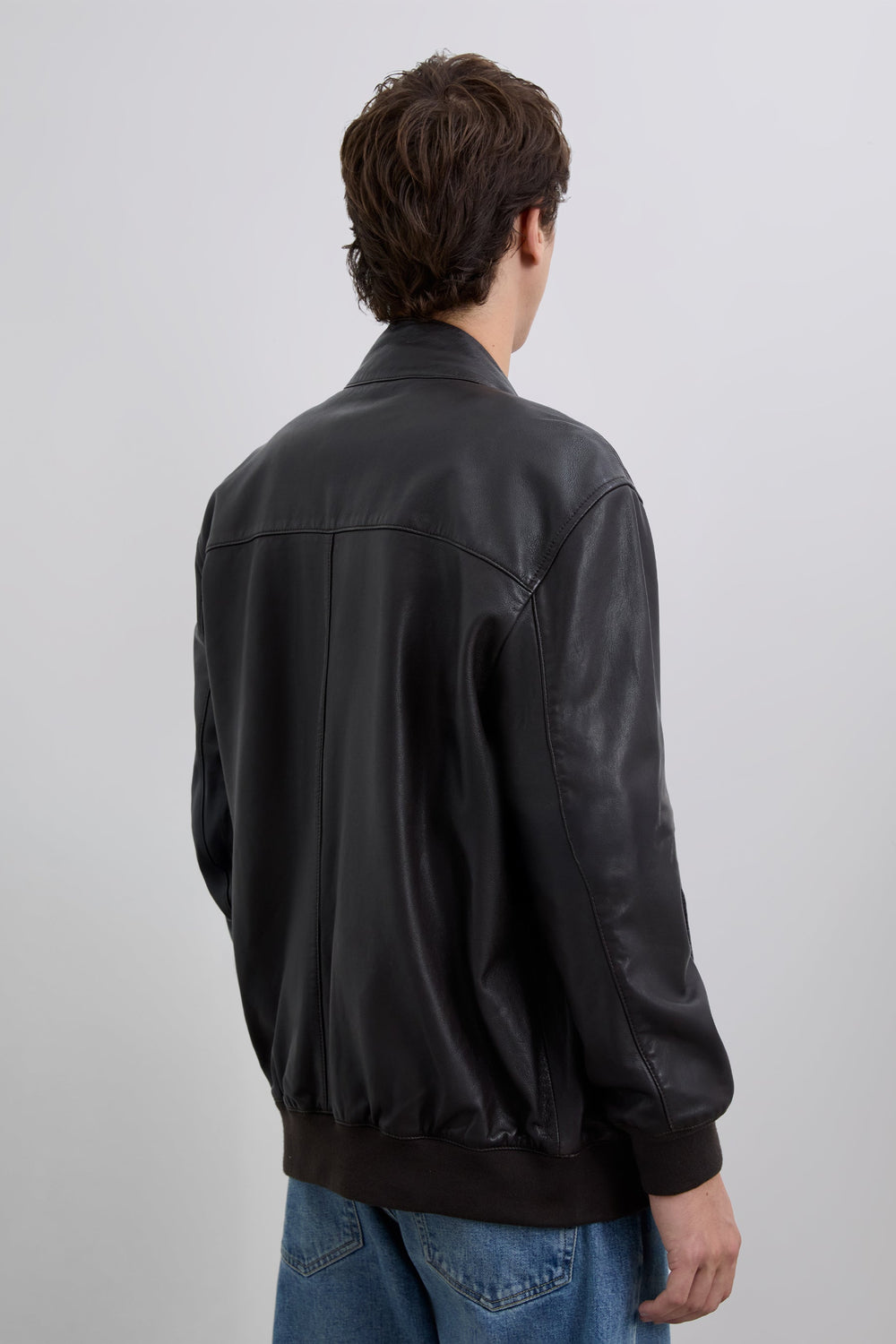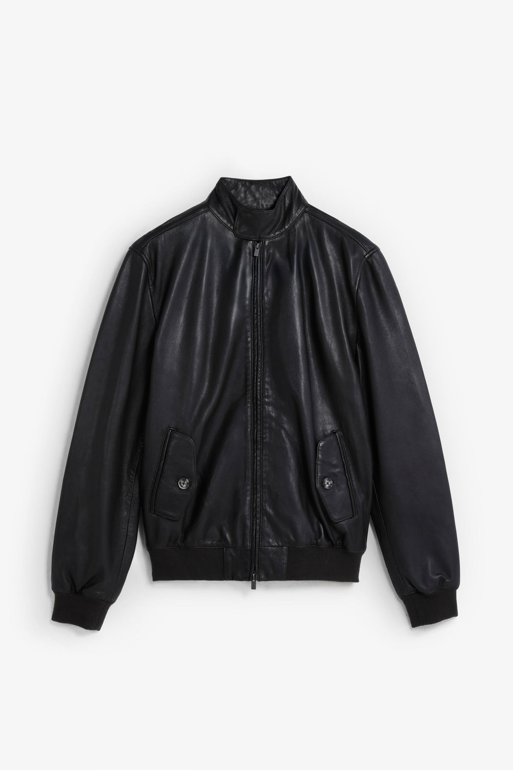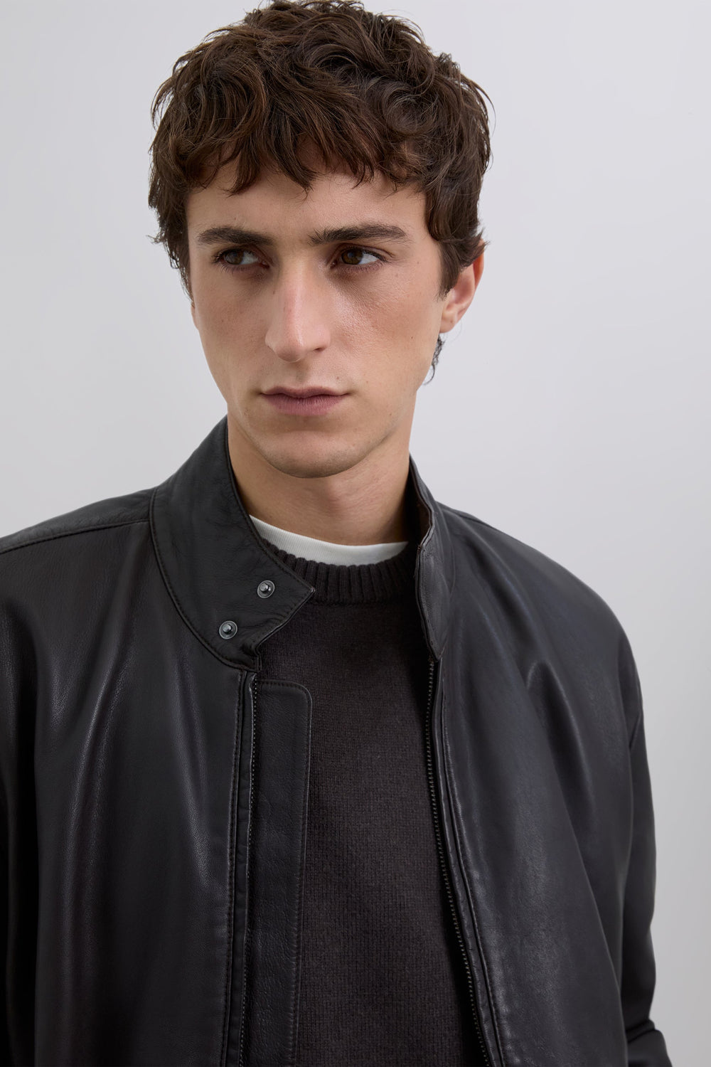 Veste 100 % cuir. Manches longues. Fermeture éclair double curseur sur le devant. Col montant à double bouton-pression. Deux poches à rabat boutonné devant. Poignets et ourlets côtelés.
