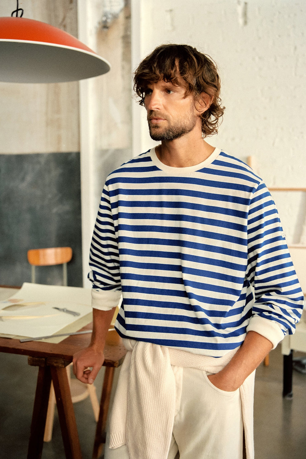 T-shirt à rayures. 100 % coton BCI. Coupe droite. Col rond. Col et poignets contrastants. Manches longues.